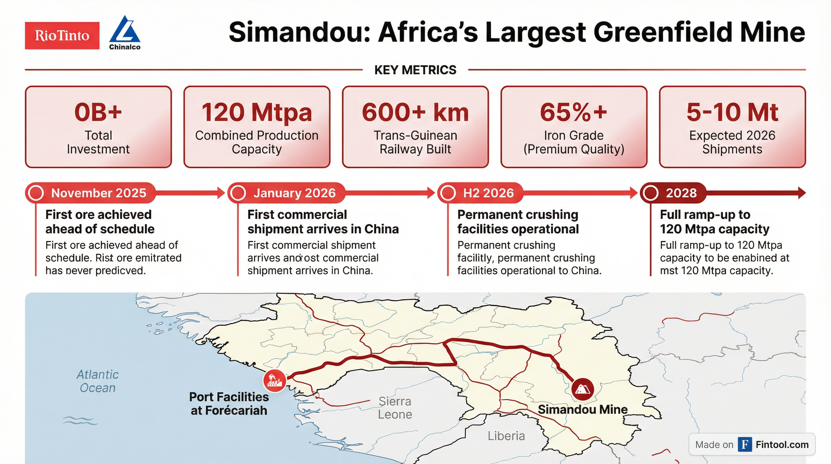 Simandou represents Africa's largest greenfield integrated mine and infrastructure project. The development includes more than 600 kilometers of new trans-Guinean railway connecting the mines in southeastern Guinea to port facilities at Forécariah, enabling combined exports of up to 120 million tonnes per year once fully ramped .