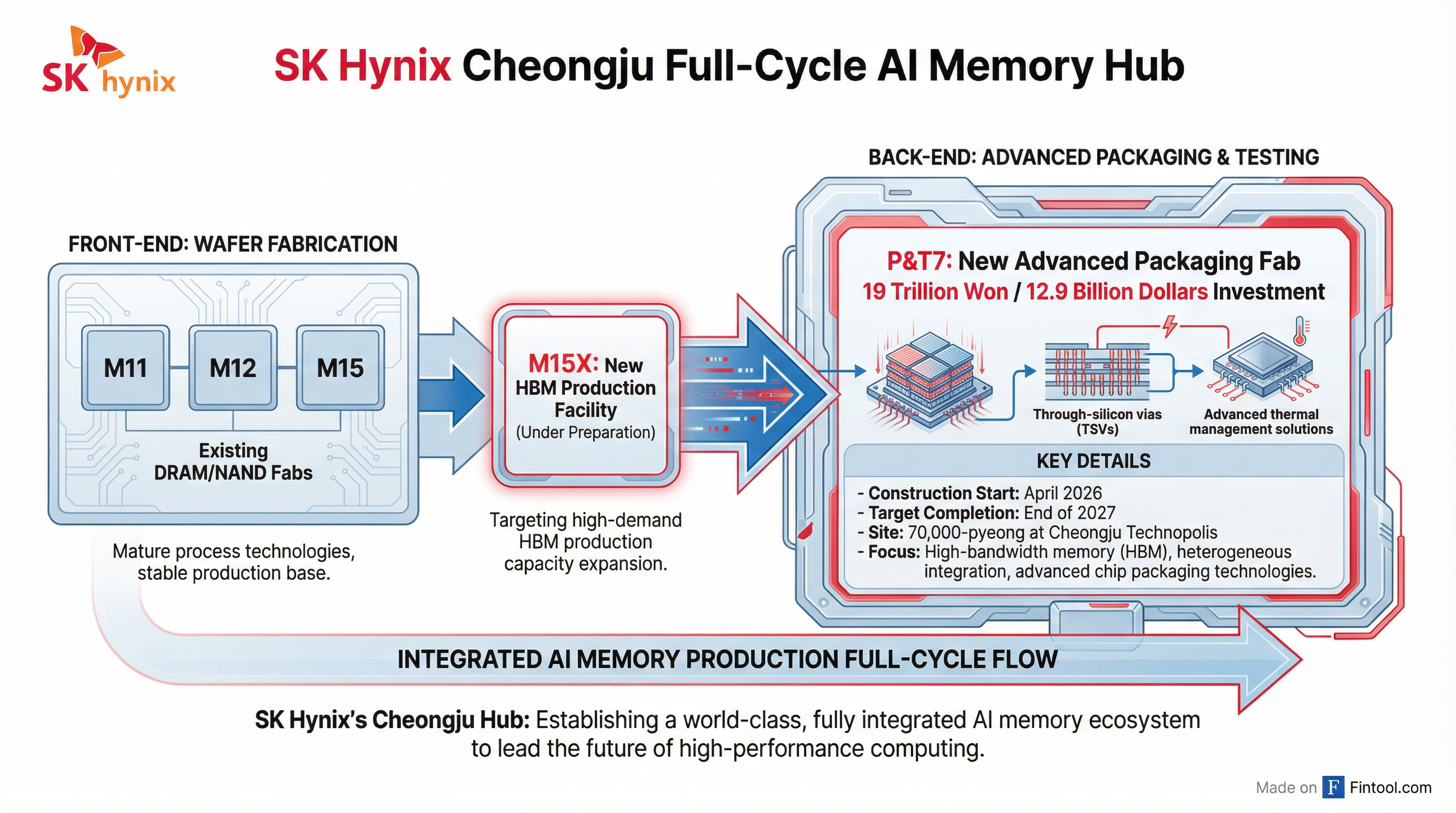 The new fabrication plant—dubbed P&T7—will be constructed in the city of Cheongju, 110 kilometers south of Seoul, with groundbreaking scheduled for April and completion targeted by the end of 2027. The investment will transform Cheongju into a comprehensive AI memory hub capable of handling both front-end wafer fabrication and back-end packaging in a single integrated cluster.