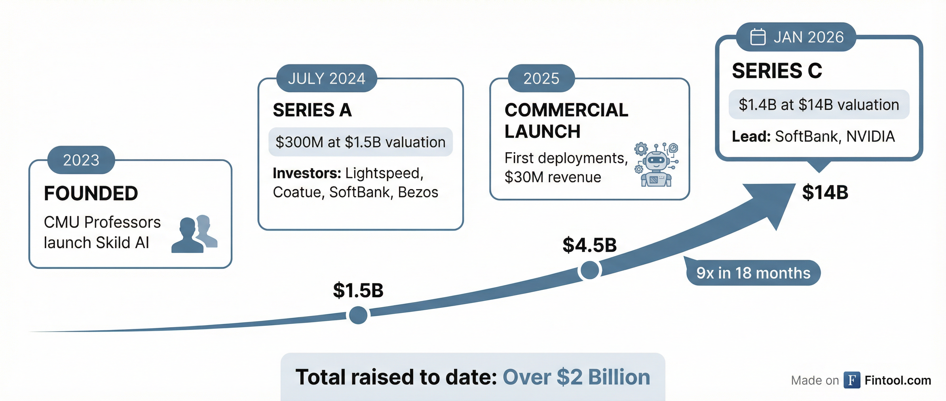 The funding brings Skild AI's total capital raised to over $2 billion since its 2023 founding. The company's ascent has been remarkably fast: