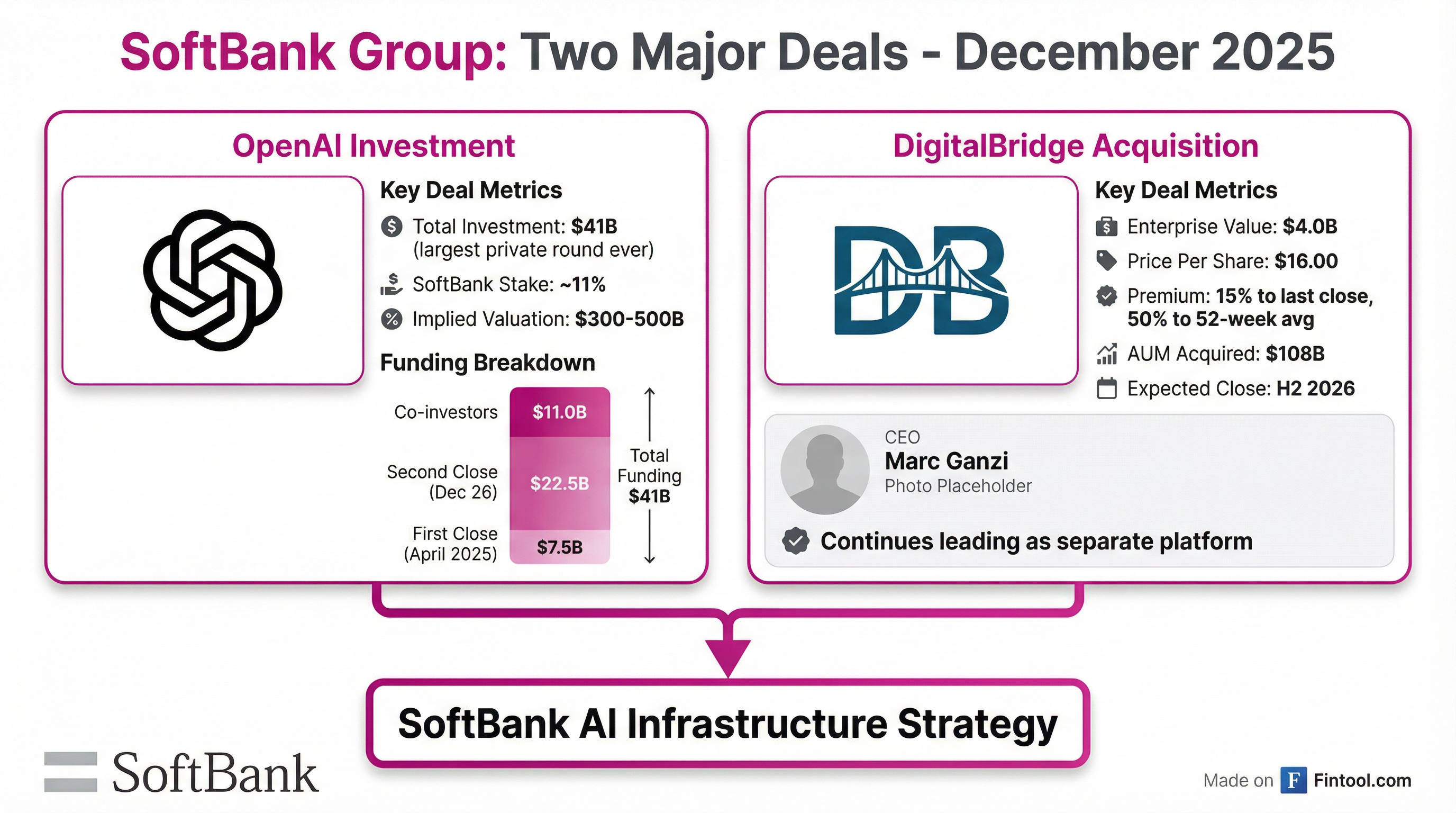 Masayoshi Son just placed the largest bet of his career on artificial intelligence. In the span of five days, SoftBank Group completed a $41 billion investment in OpenAI—the largest private funding round in history—and announced a $4 billion acquisition of Digitalbridge+0.43%, a leading digital infrastructure investment firm managing $108 billion in assets.