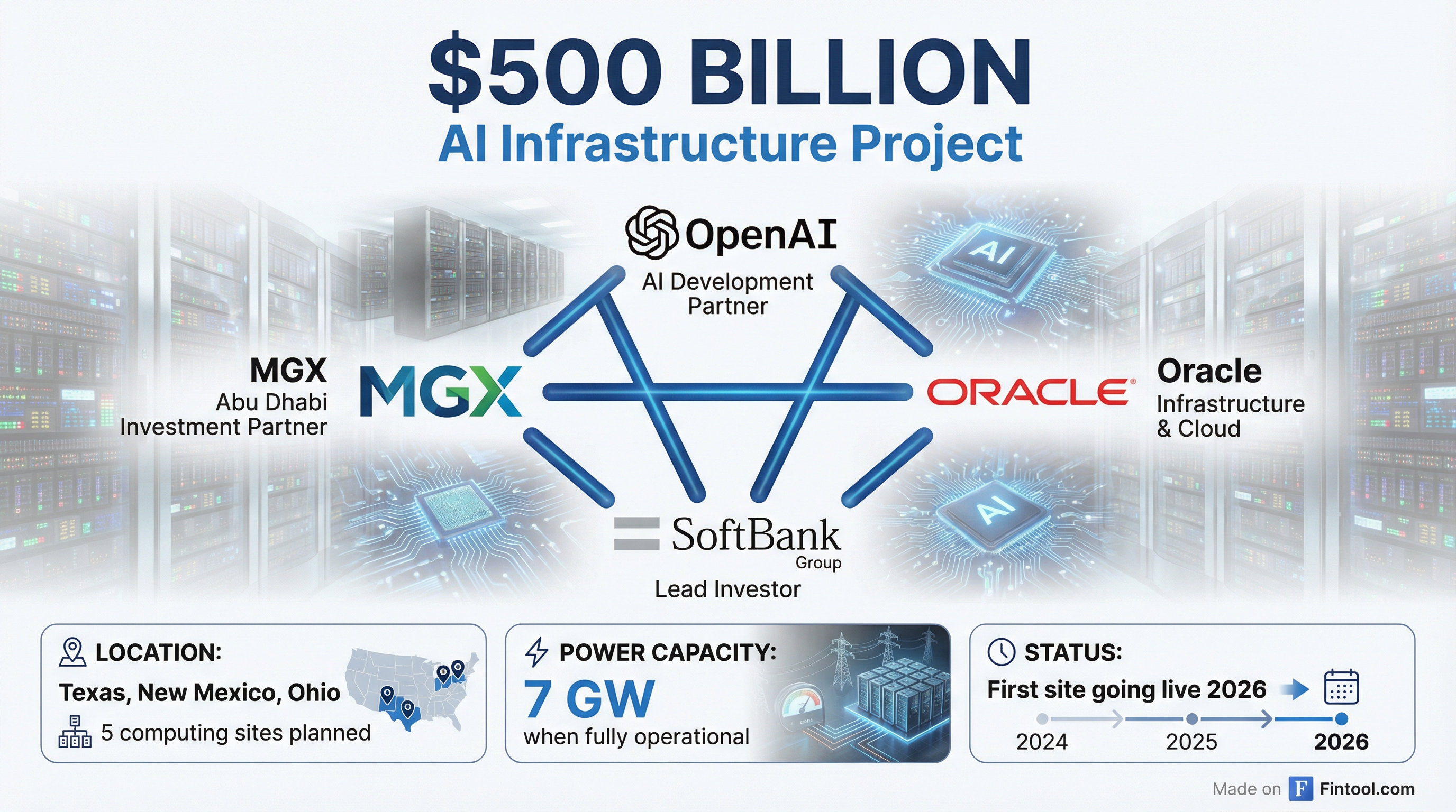 Both transactions feed into SoftBank's position in the $500 billion Stargate Project—the massive AI infrastructure initiative announced by President Trump in January 2025. SoftBank joins Oracle-1.17%, OpenAI, and Abu Dhabi-based MGX as lead partners in building AI data centers across Texas, New Mexico, and Ohio.