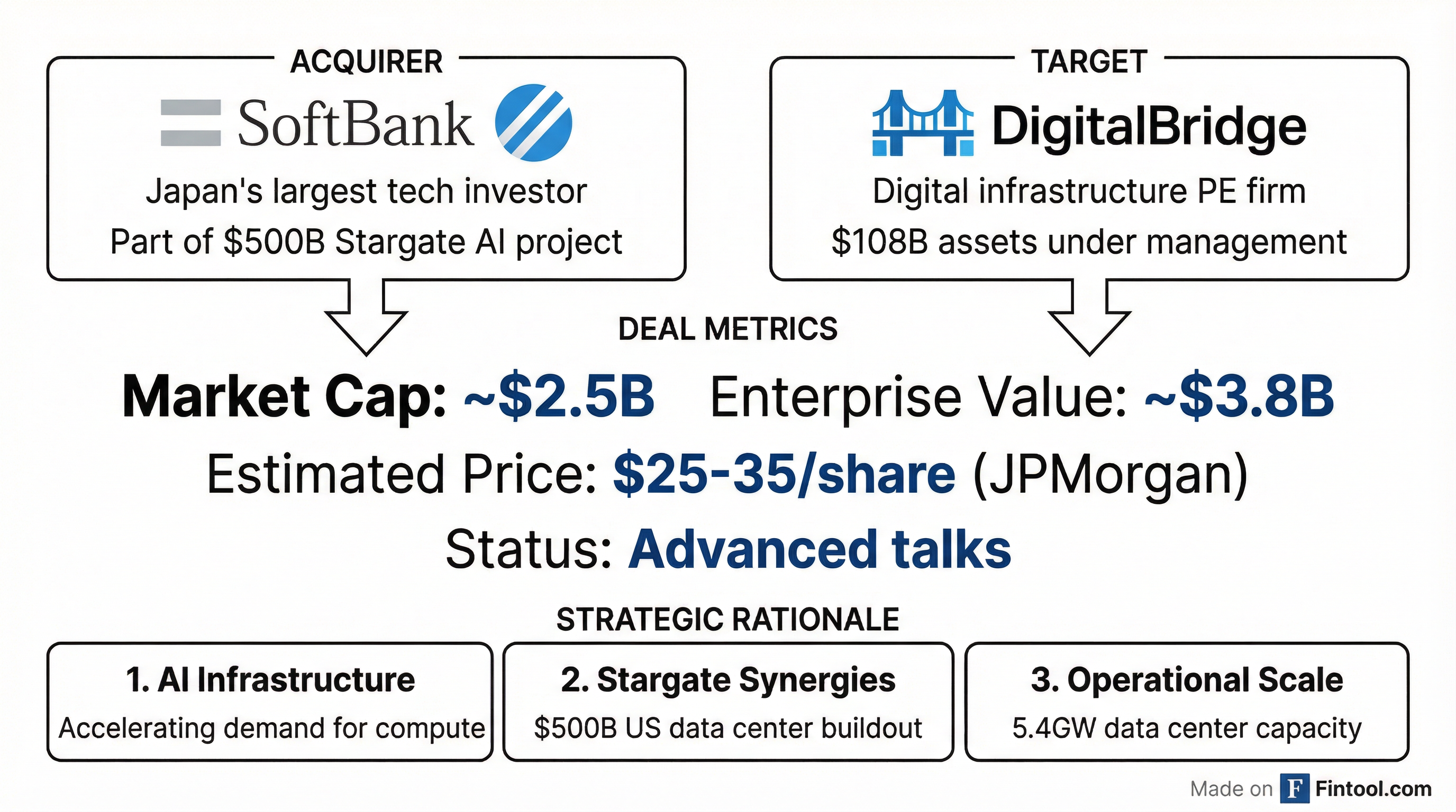SoftBank previously acquired Fortress Investment Group for over $3 billion in 2017 before selling its stake in a deal completed in 2024 to Mubadala and Fortress management. The DigitalBridge deal represents a return to asset management M&A, but with a laser focus on digital infrastructure.