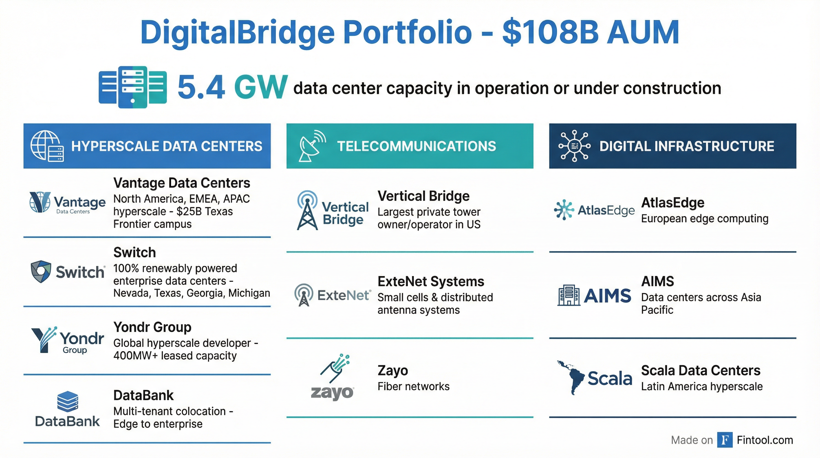 Combined, DigitalBridge's portfolio companies have more than 5.4 gigawatts of data center capacity in operation or under construction—the kind of scale that hyperscalers and AI companies desperately need.