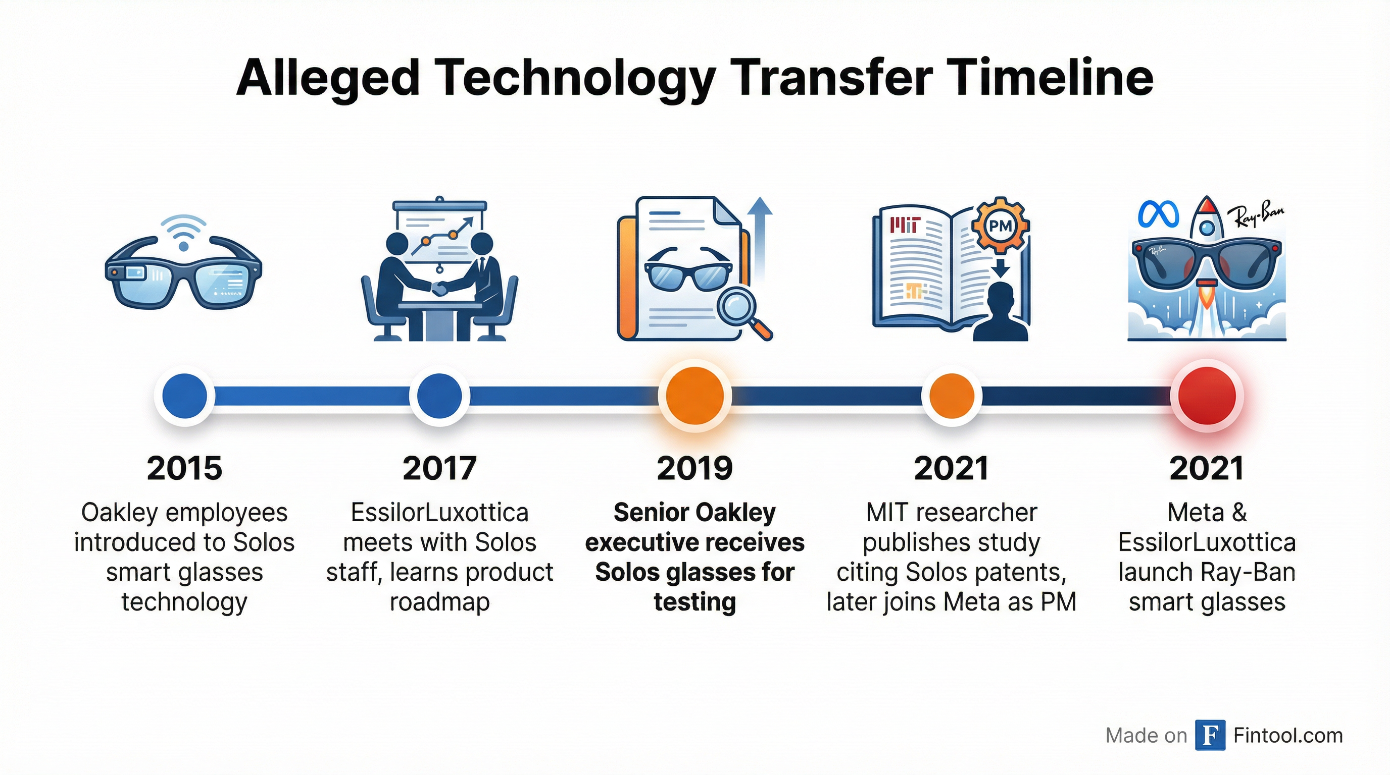 According to the complaint, Oakley employees were introduced to Solos' smart glasses technology as early as 2015. By 2017, EssilorLuxottica was meeting regularly with Solos staff and learning about the company's product roadmap.
