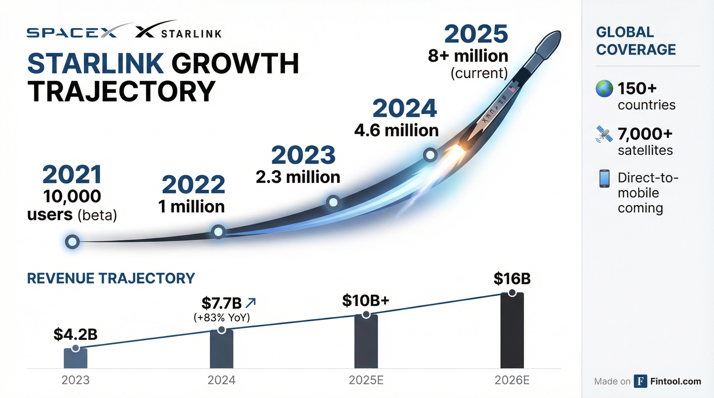 The bullish case for SpaceX centers on Starlink, its satellite internet service that has become the company's dominant revenue driver. From just 10,000 beta users in 2021, Starlink has grown to over 8 million subscribers across more than 150 countries.