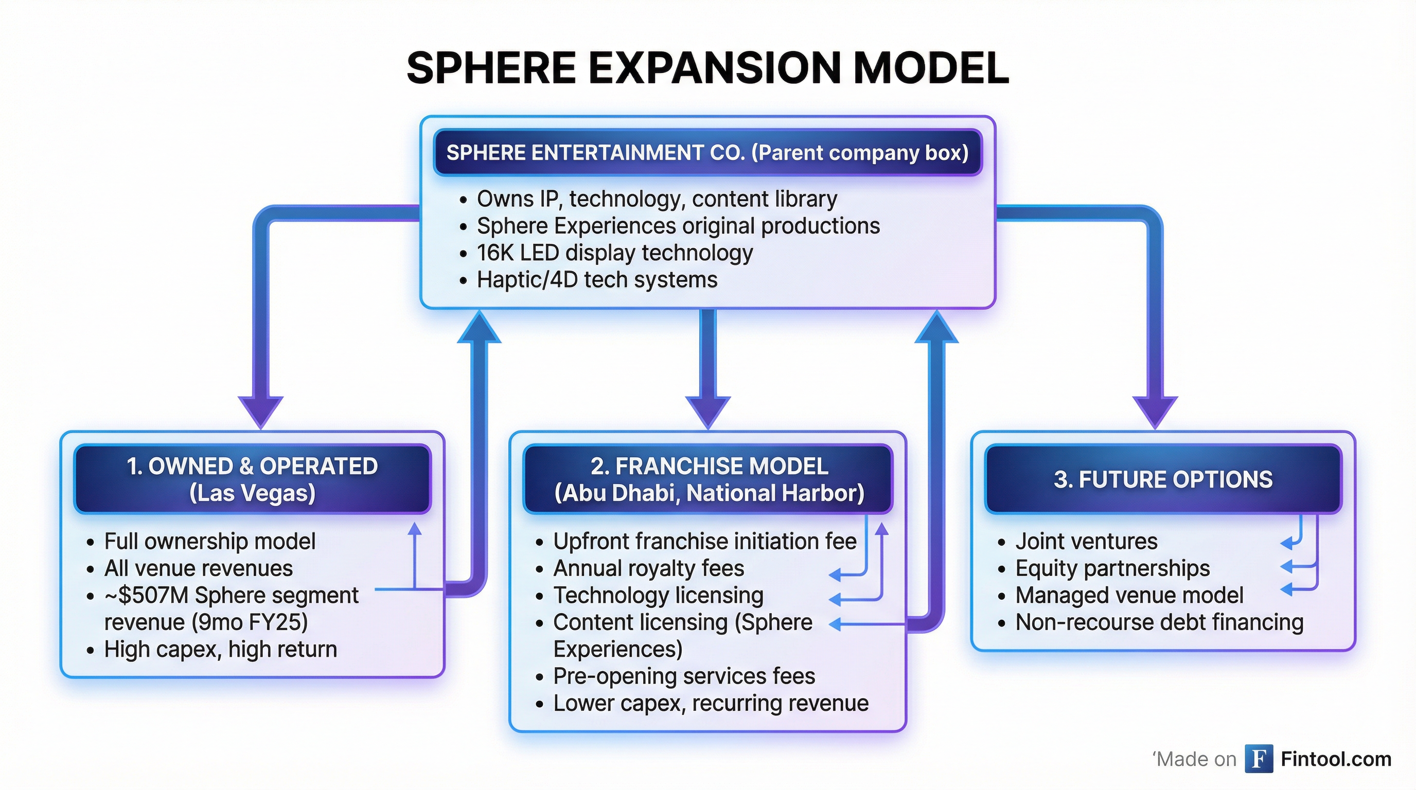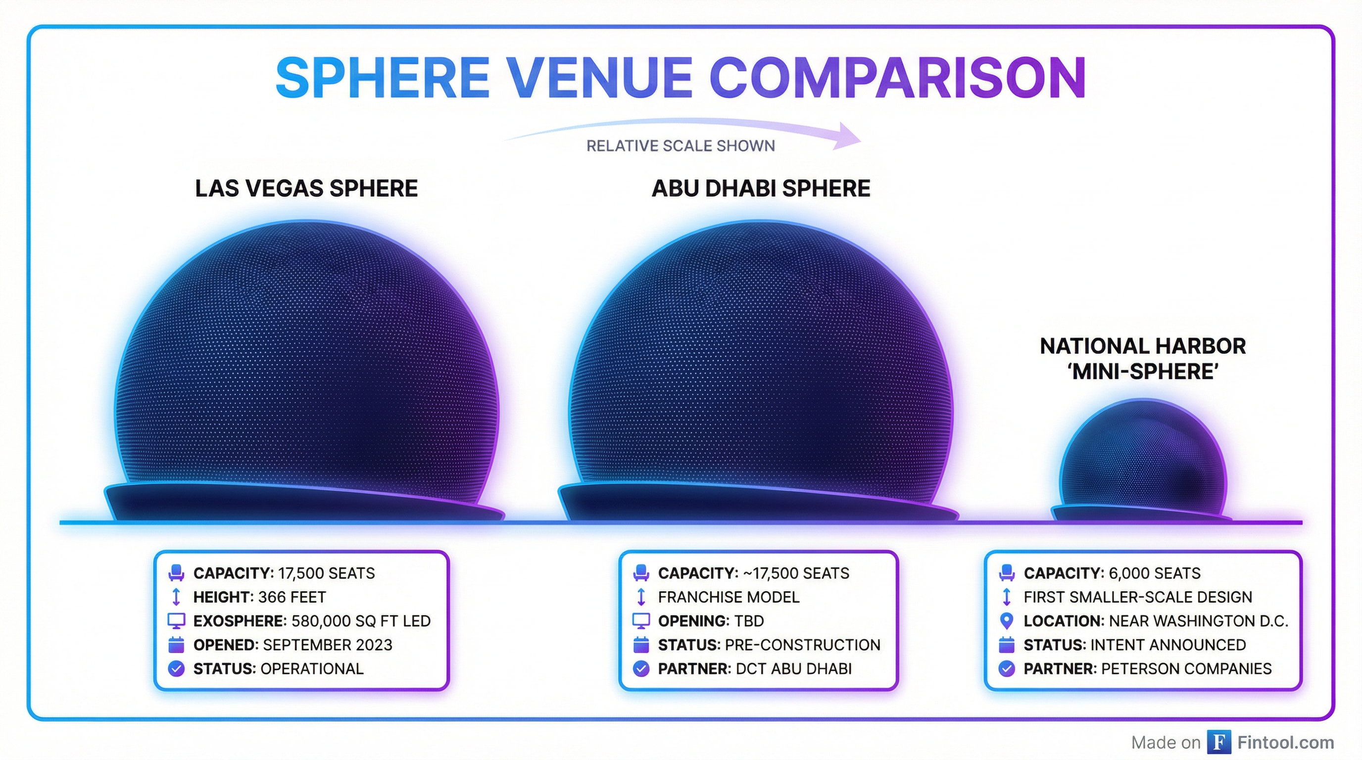 The National Harbor announcement signals Sphere is pursuing the same franchise approach it established with Abu Dhabi—where DCT Abu Dhabi is funding construction while Sphere collects franchise fees, royalties, and service revenue.