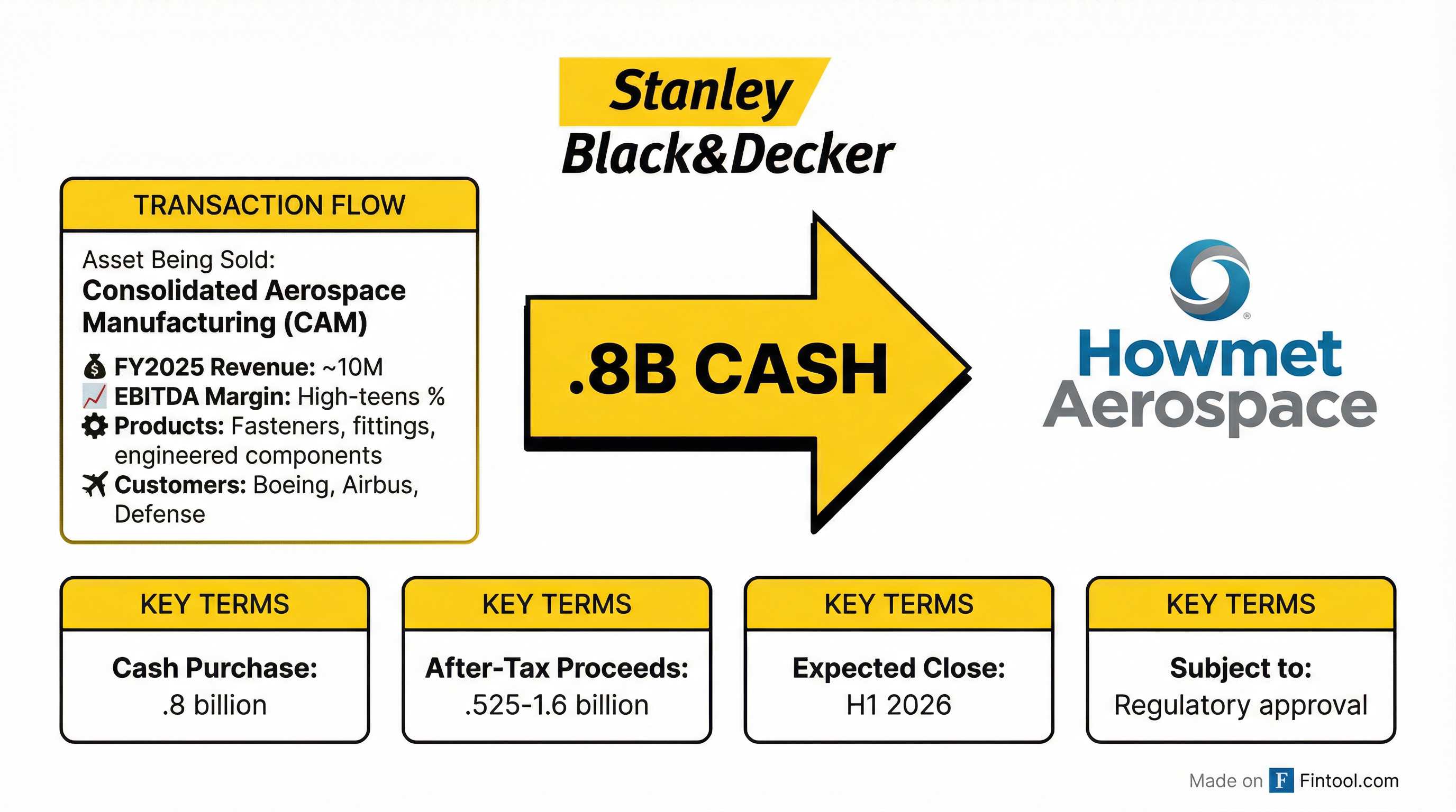 The deal, expected to close in the first half of 2026, crystallizes a non-core asset that had become one of Stanley Black & Decker's best-performing businesses. CAM's aerospace fasteners and fittings division grew over 25% organically in Q3 2025, far outpacing the company's struggling tools and outdoor segments. But management made clear: the future lies in DEWALT, Stanley, and Craftsman—not aerospace components.