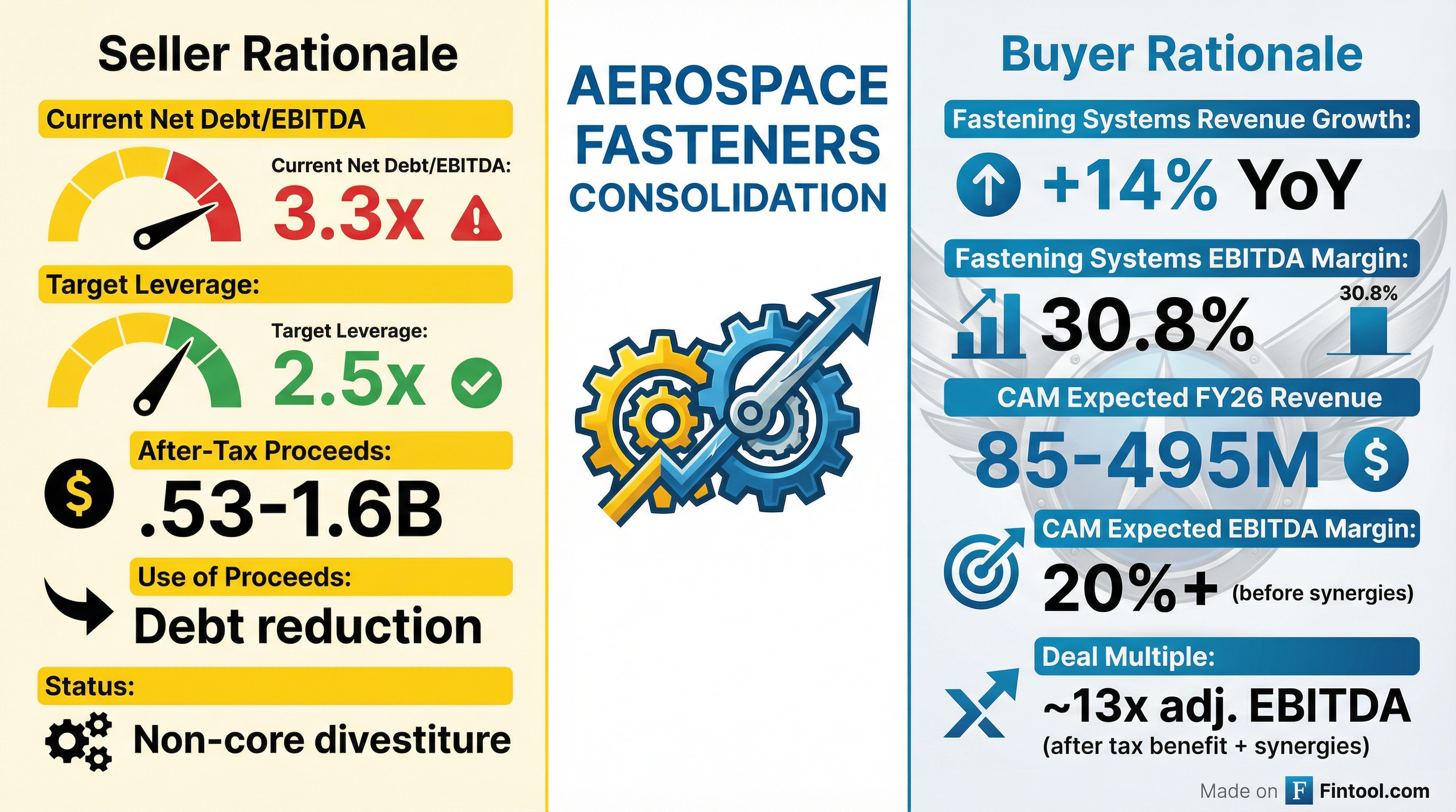 For Howmet, the math looks different. The aerospace components maker expects CAM to generate FY2026 revenue of $485-495 million—a meaningful revenue acceleration—with adjusted EBITDA margins exceeding 20% before synergies. Including synergies and favorable tax treatment, Howmet projects an effective acquisition multiple of approximately 13x adjusted EBITDA.