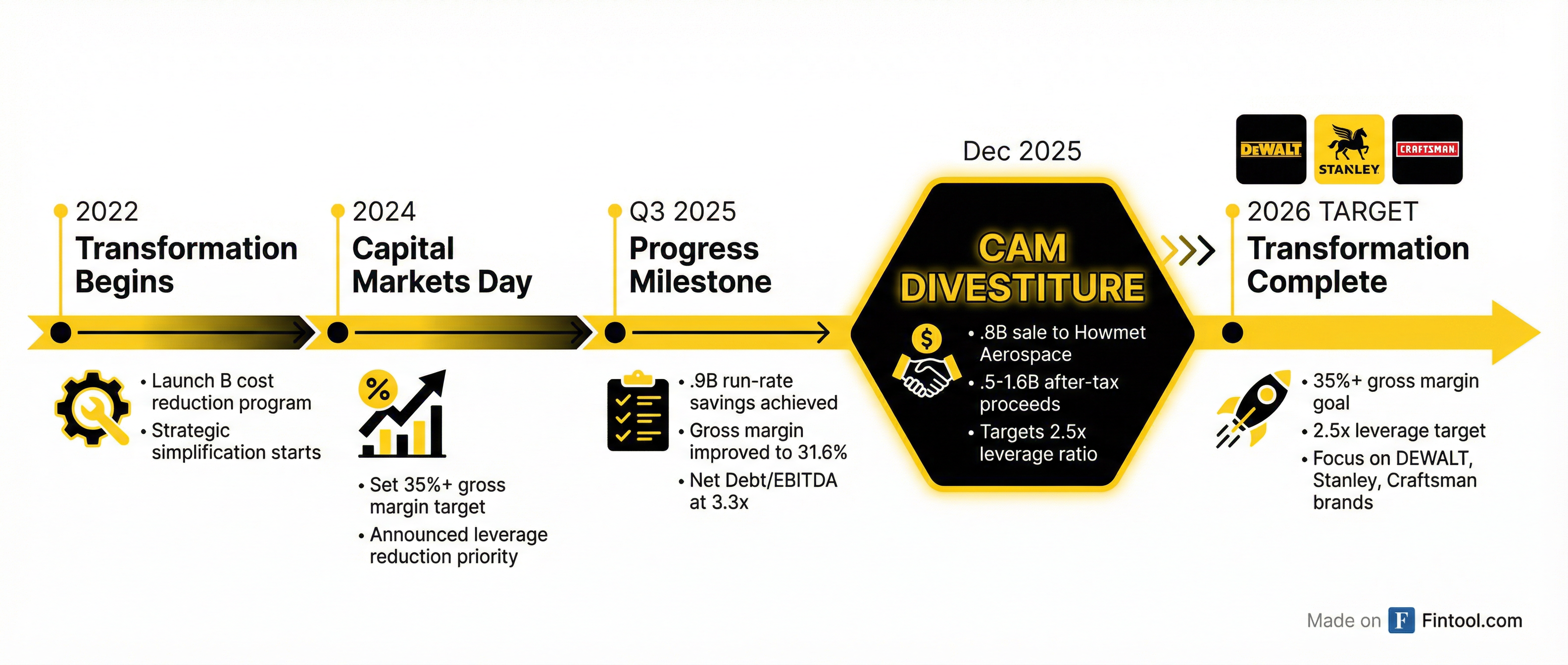 The broader context: Stanley Black & Decker launched a sweeping transformation in mid-2022, targeting $2 billion in cost savings by year-end 2025. Through Q3, the company had achieved approximately $1.9 billion in pre-tax run-rate savings. Gross margins have steadily improved—from the mid-20s during the transformation's nadir to 31.6% in Q3 2025, with management still targeting 35%+ by Q4 2026.