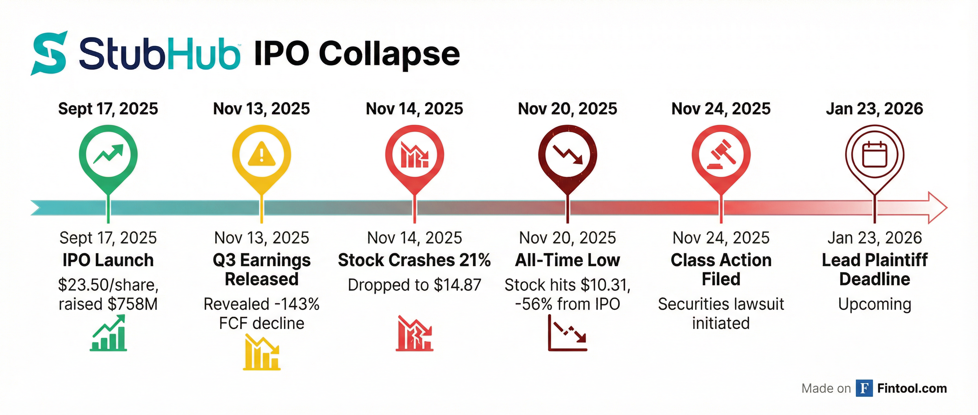Stubhub Holdings-2.80% is facing a securities class action lawsuit less than three months after its September IPO, after the company disclosed a 143% collapse in free cash flow that sent shares tumbling 56% below the $23.50 offering price. The lawsuit alleges the ticketing giant's registration statement failed to disclose "known trends" in vendor payments that were already adversely impacting liquidity when the company went public.