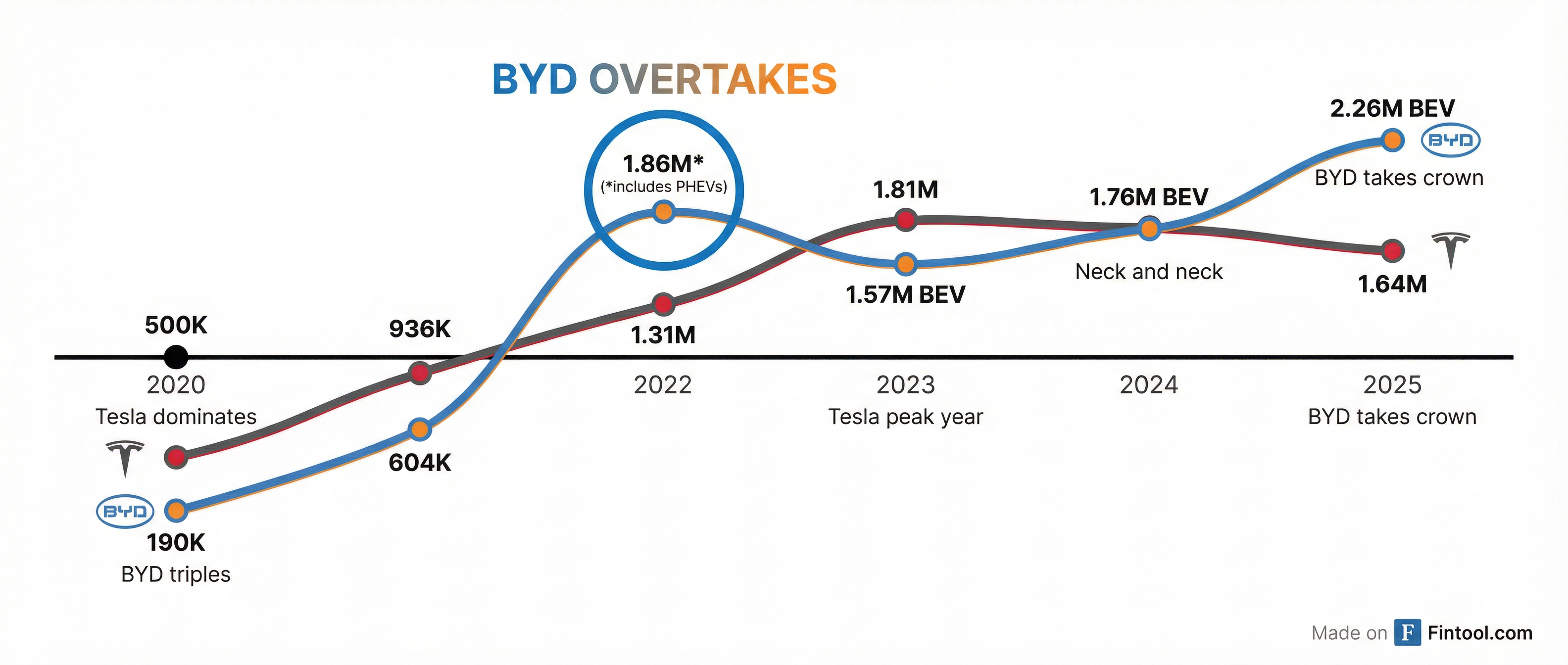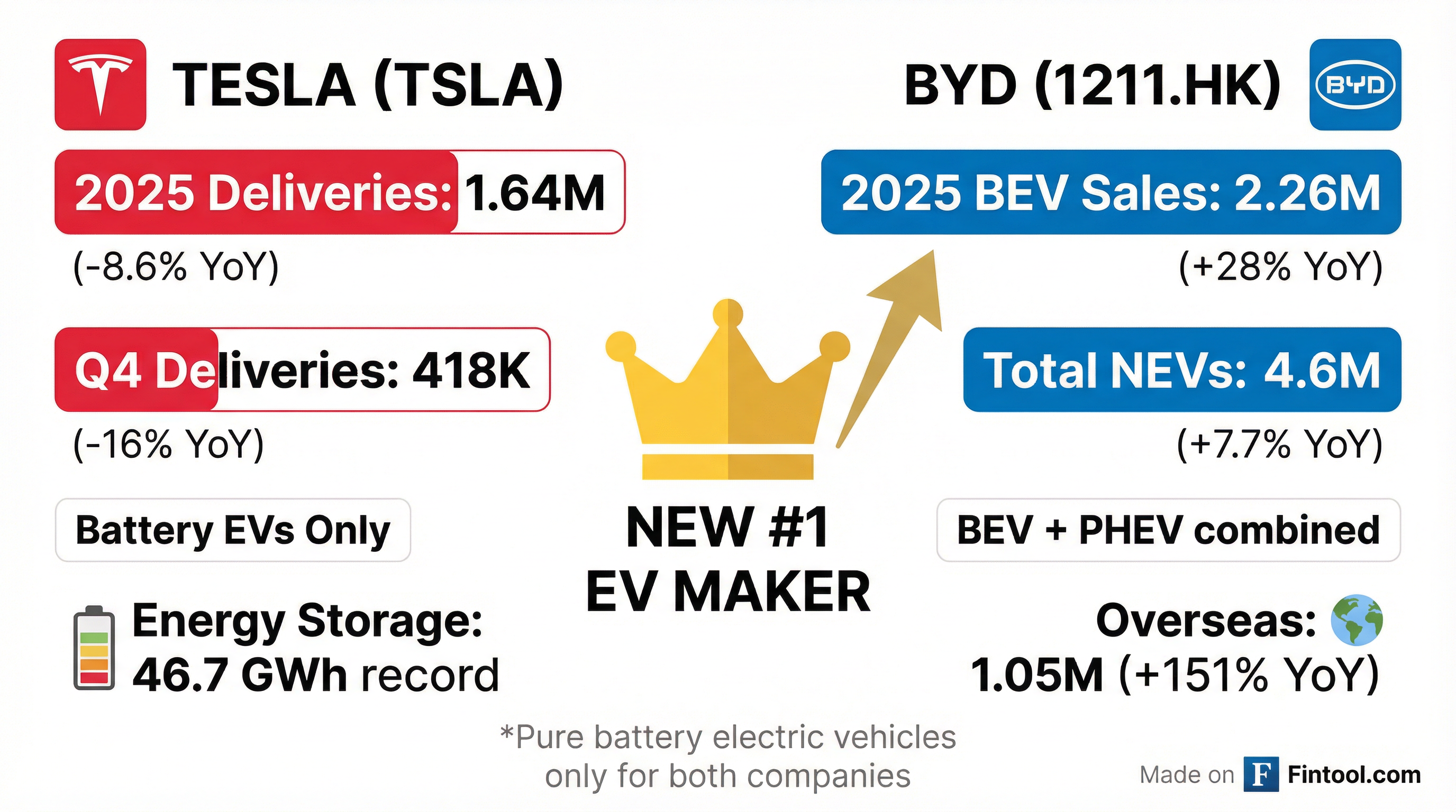 BYD's ascent has been nothing short of remarkable. The Shenzhen-based company—which Musk famously laughed at during a 2011 Bloomberg interview—sold 4.6 million total new energy vehicles in 2025, including 2.26 million pure battery EVs.
