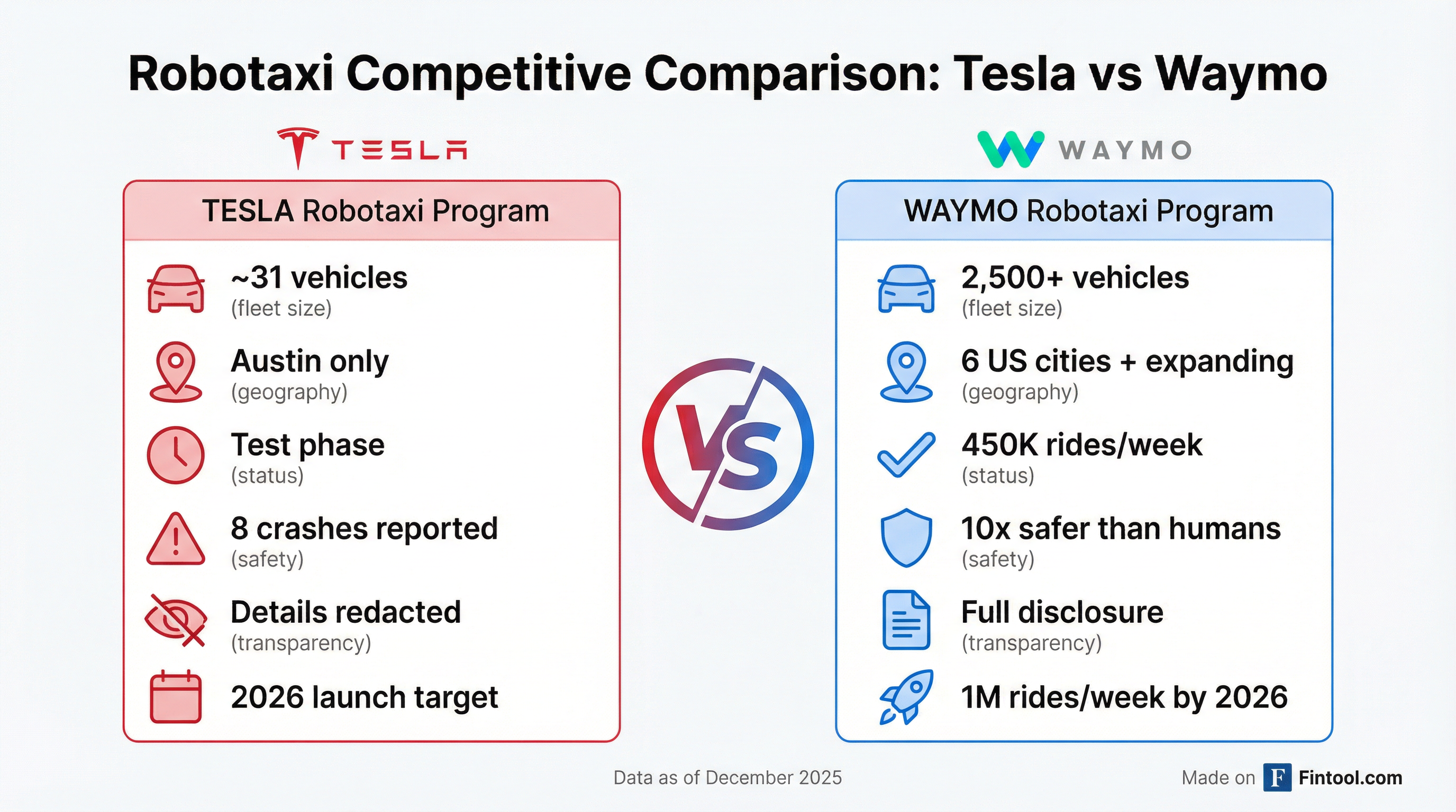 But beneath the headline achievement lies a more complex picture: a small fleet with a concerning crash rate, redacted safety reports, and a competitor operating at 15,000 times the scale.