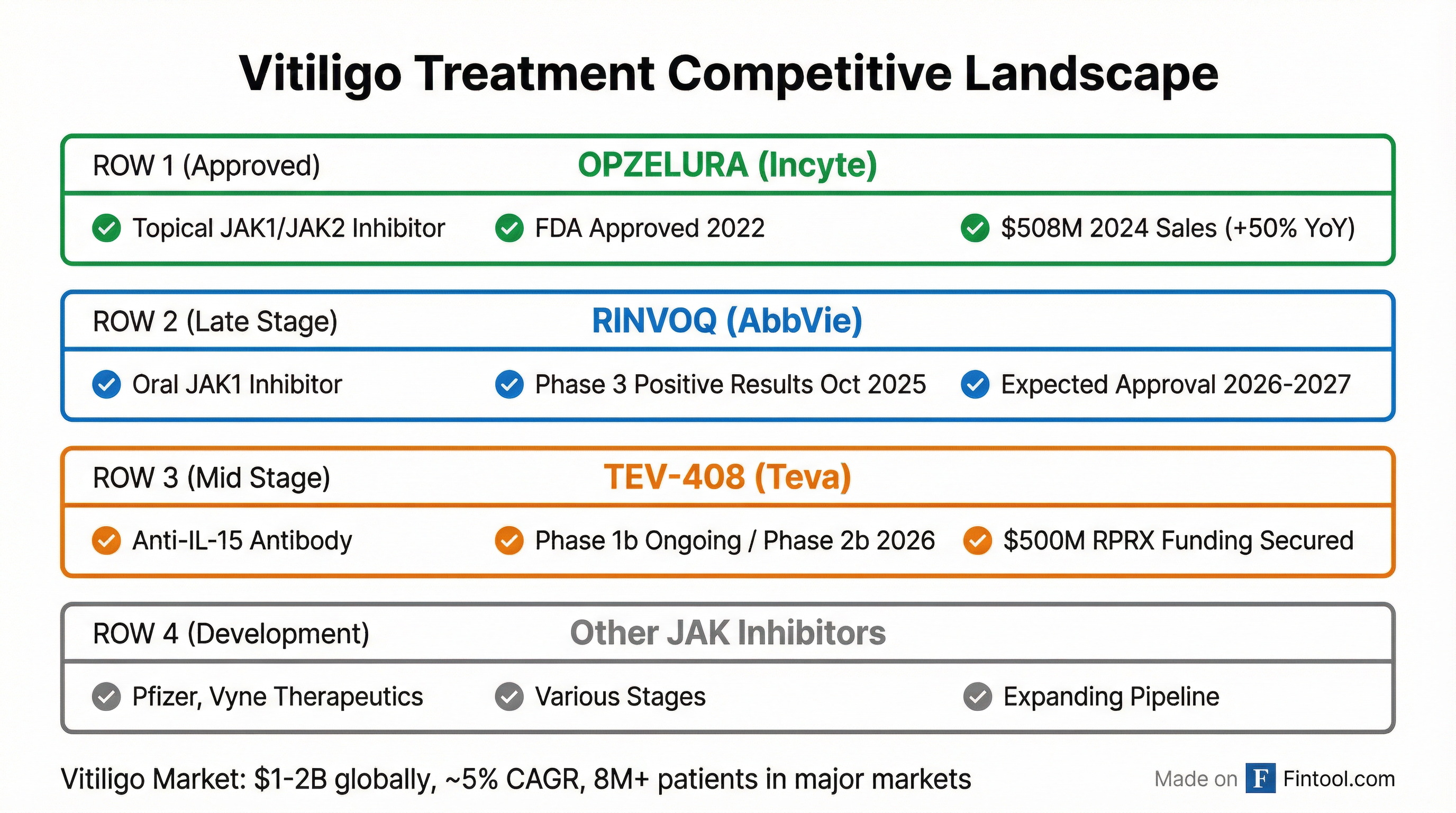 The vitiligo landscape is rapidly evolving from a market with no approved treatments to one with multiple therapeutic classes competing for patients. Teva's $500 million bet—and Royalty Pharma's willingness to back it—suggests both see opportunity in a differentiated mechanism.