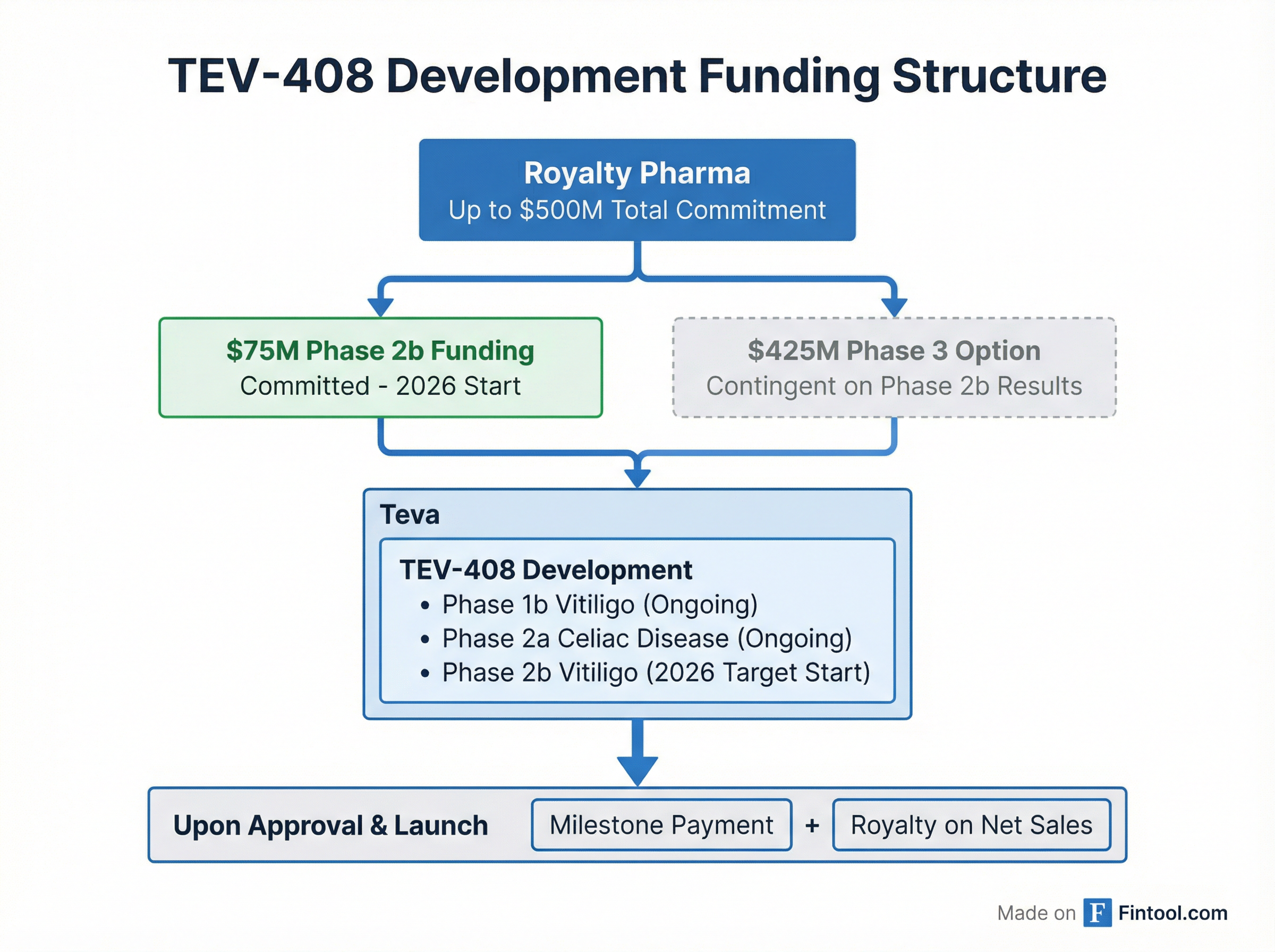 Royalty Pharma-0.22% is committing up to $500 million to accelerate development of Teva-1.54%'s anti-IL-15 antibody TEV-408 for vitiligo—a skin condition affecting over 8 million patients in major markets with only one FDA-approved treatment option.