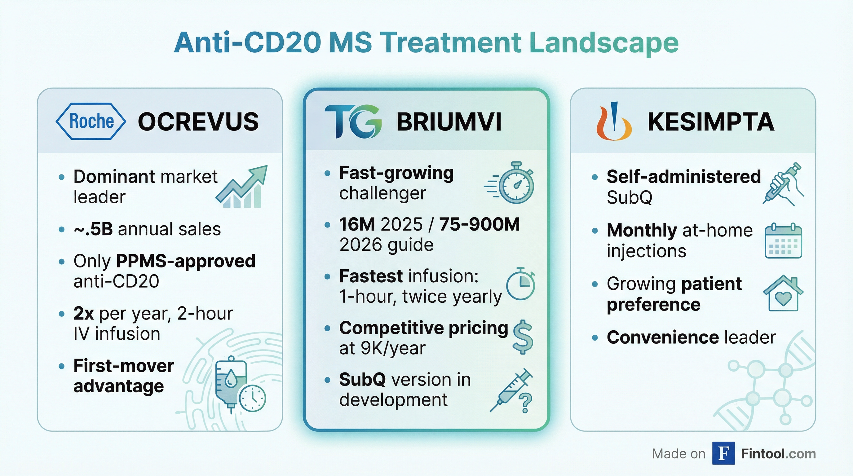 BRIUMVI competes in the anti-CD20 monoclonal antibody class, where it faces two established competitors: Roche's Ocrevus and Novartis's Kesimpta.