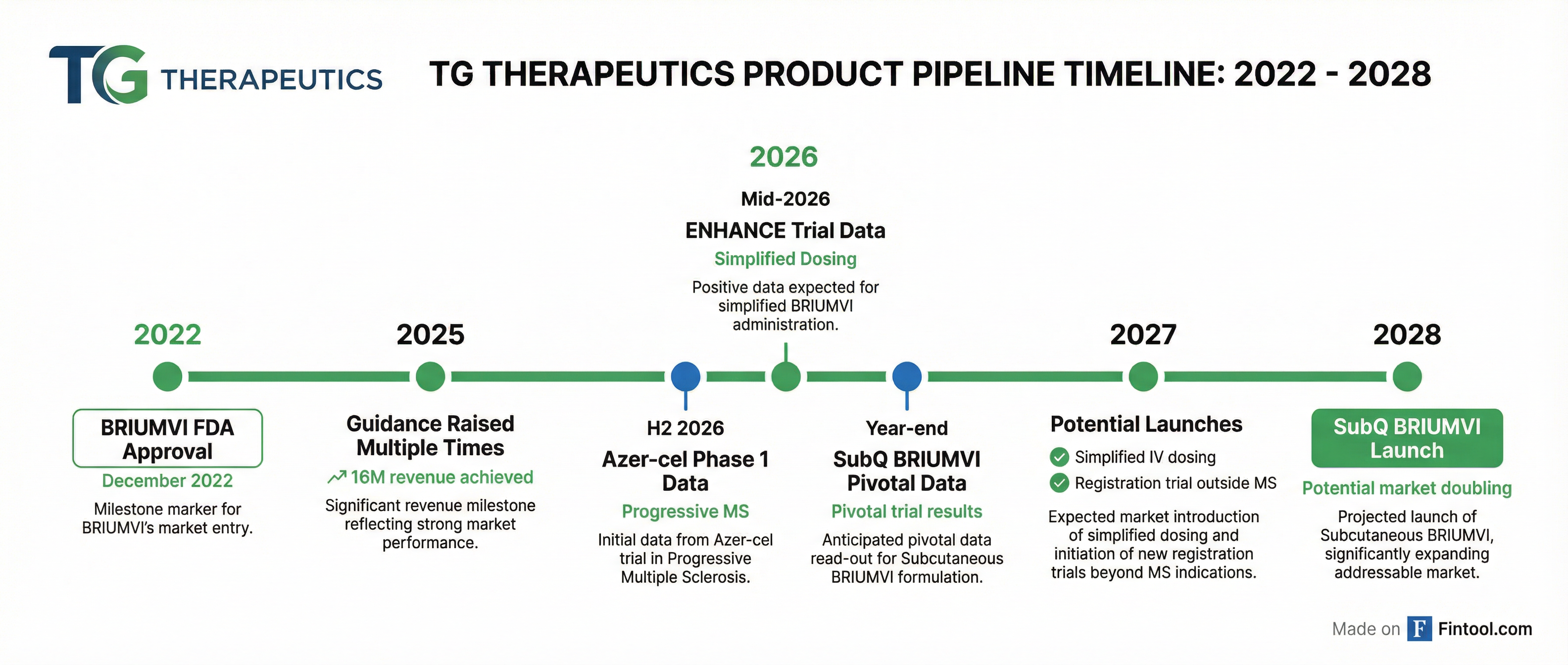 Year-end 2026/Q1 2027: Subcutaneous BRIUMVI Pivotal Data. The Phase 3 trial tests two dosing schedules—once every other month and once quarterly—for a self-administered product. If approved, TG would be the only company offering both IV and self-administered CD20 options for MS.
