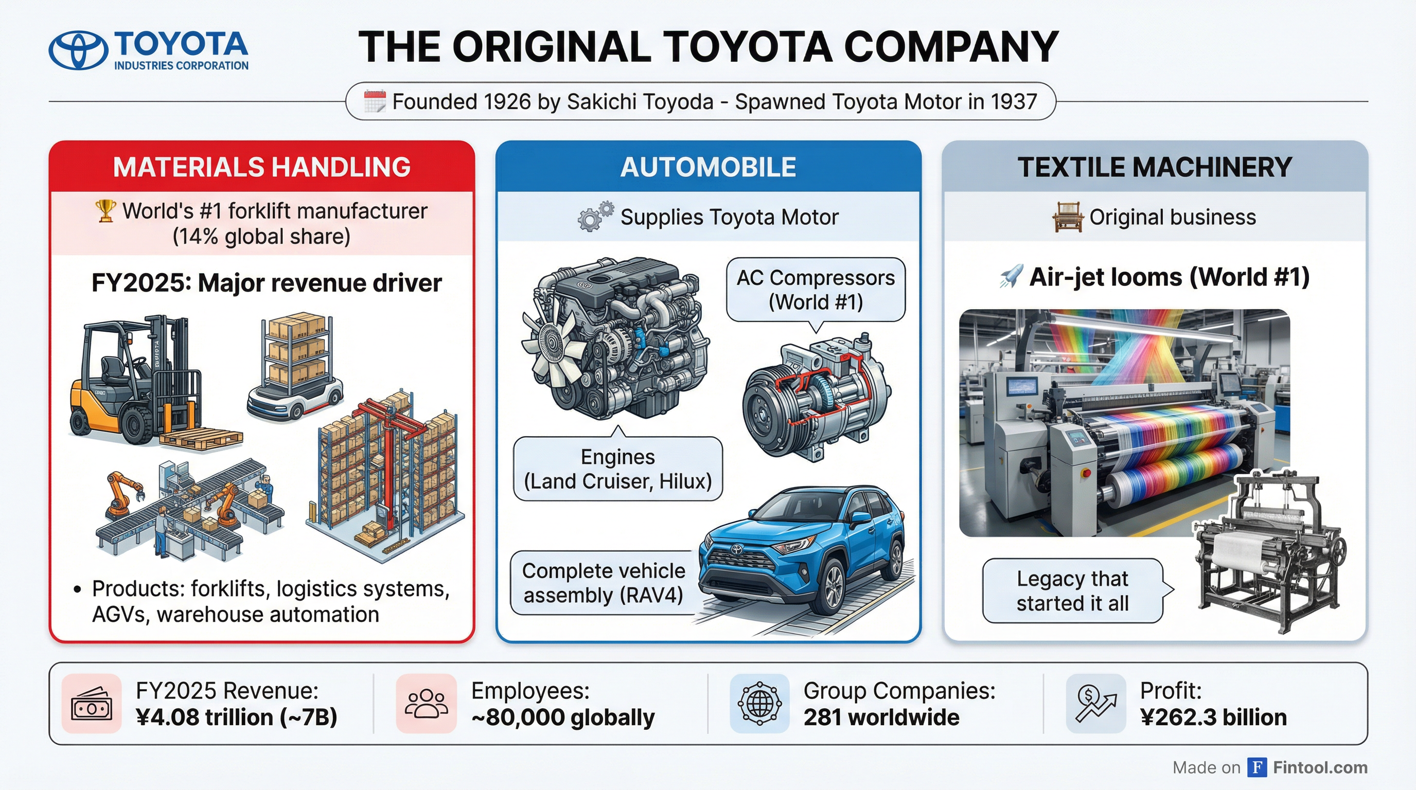 Toyota Industries is no ordinary acquisition target. Founded in 1926 by Sakichi Toyoda, the company is the original Toyota business—the textile machinery manufacturer from which Toyota Motor was spun off in 1937.