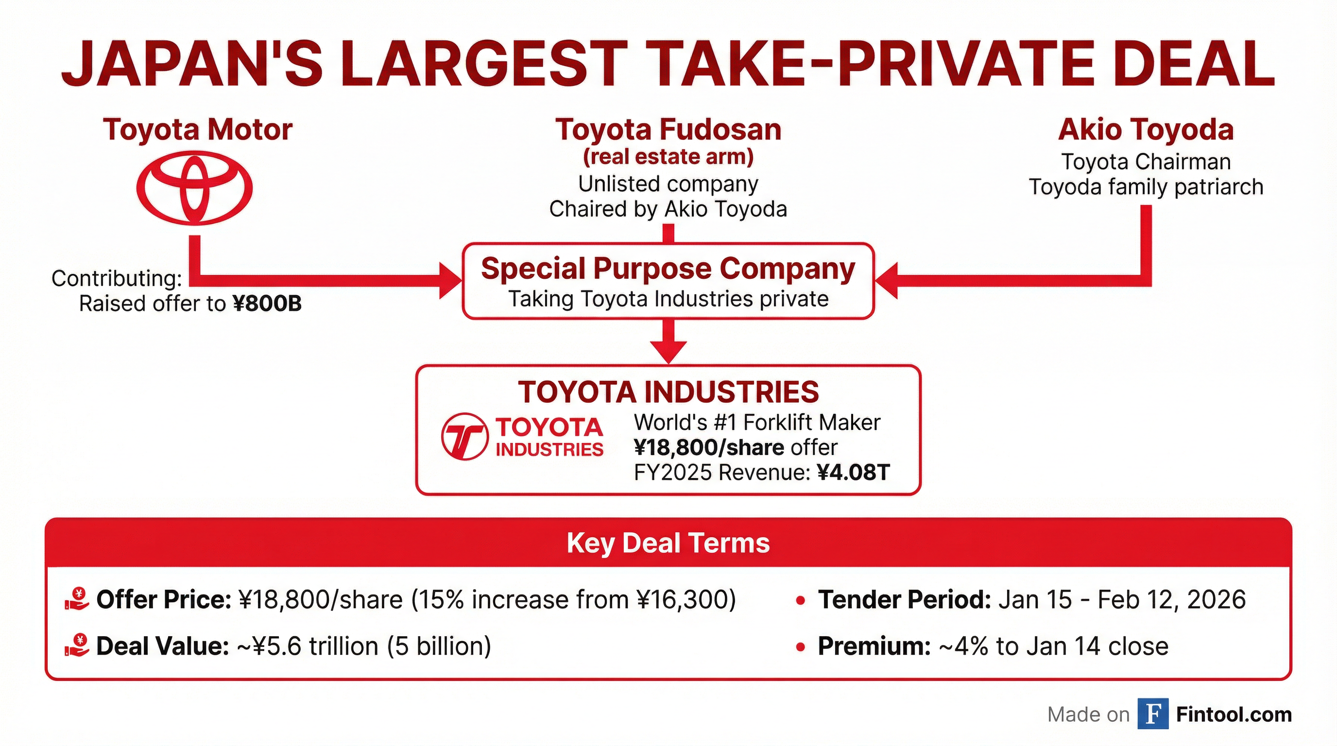 The transaction will take Toyota Industries private through a special-purpose company controlled primarily by Toyota Fudosan, an unlisted real estate firm chaired by Akio Toyoda—the Toyota Motor chairman and great-grandson of Toyota Industries founder Sakichi Toyoda.