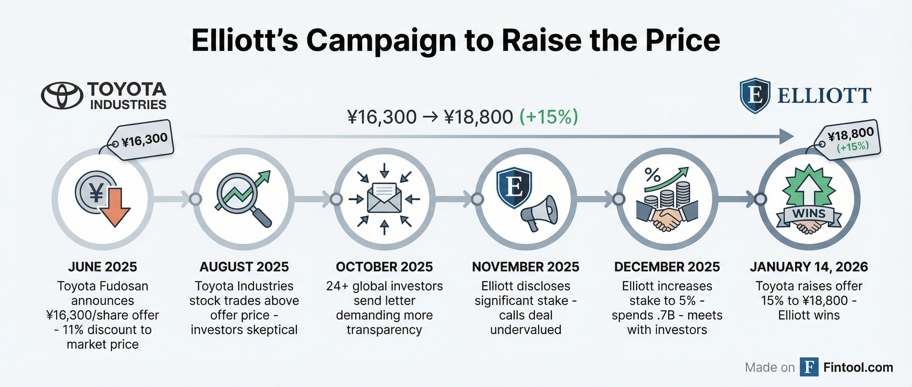 The revised price represents a major victory for Elliott Investment Management, which spent $1.7 billion building a 5% stake and waged a public campaign arguing the original ¥16,300 offer significantly undervalued the nearly century-old company that spawned the Toyota automotive empire.