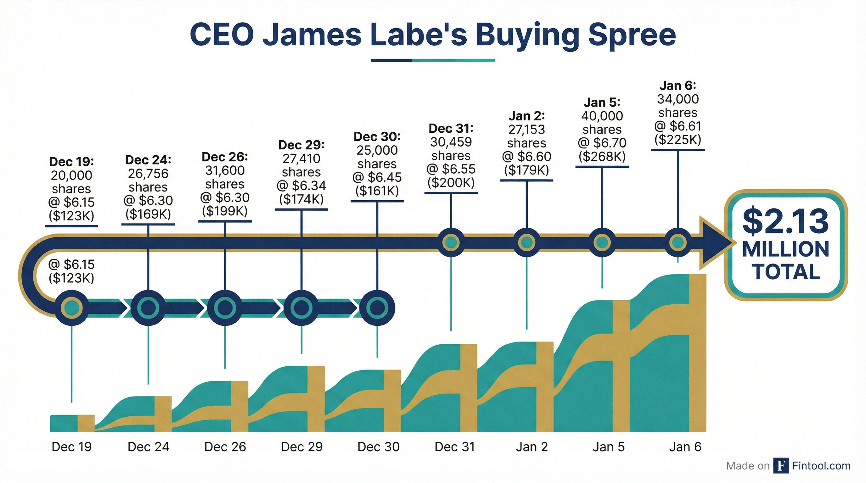 The buying began on December 19 and continued through January 6, with Labe purchasing shares almost daily at prices ranging from $6.15 to $6.70. His most recent filings show purchases of 40,000 shares on January 5 and 34,000 shares on January 6, bringing his total stake to roughly 1.88 million shares worth approximately $12.6 million.