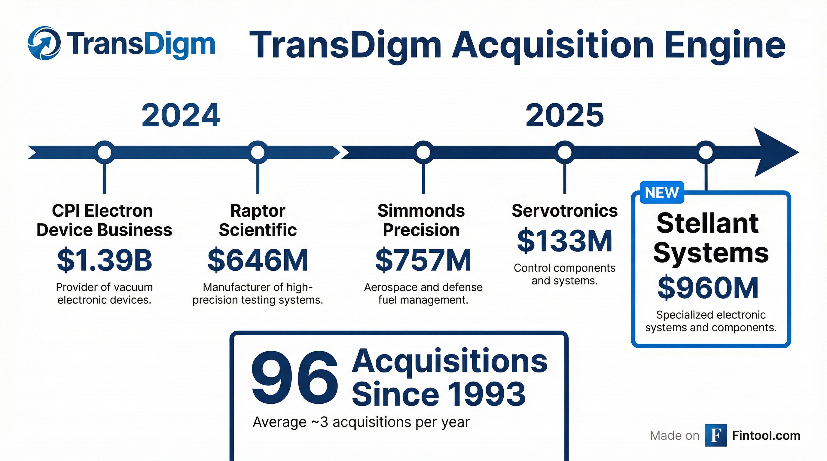 This isn't a one-off. TransDigm has built its business through serial acquisitions, completing 96 deals since its founding in 1993—roughly three per year on average.