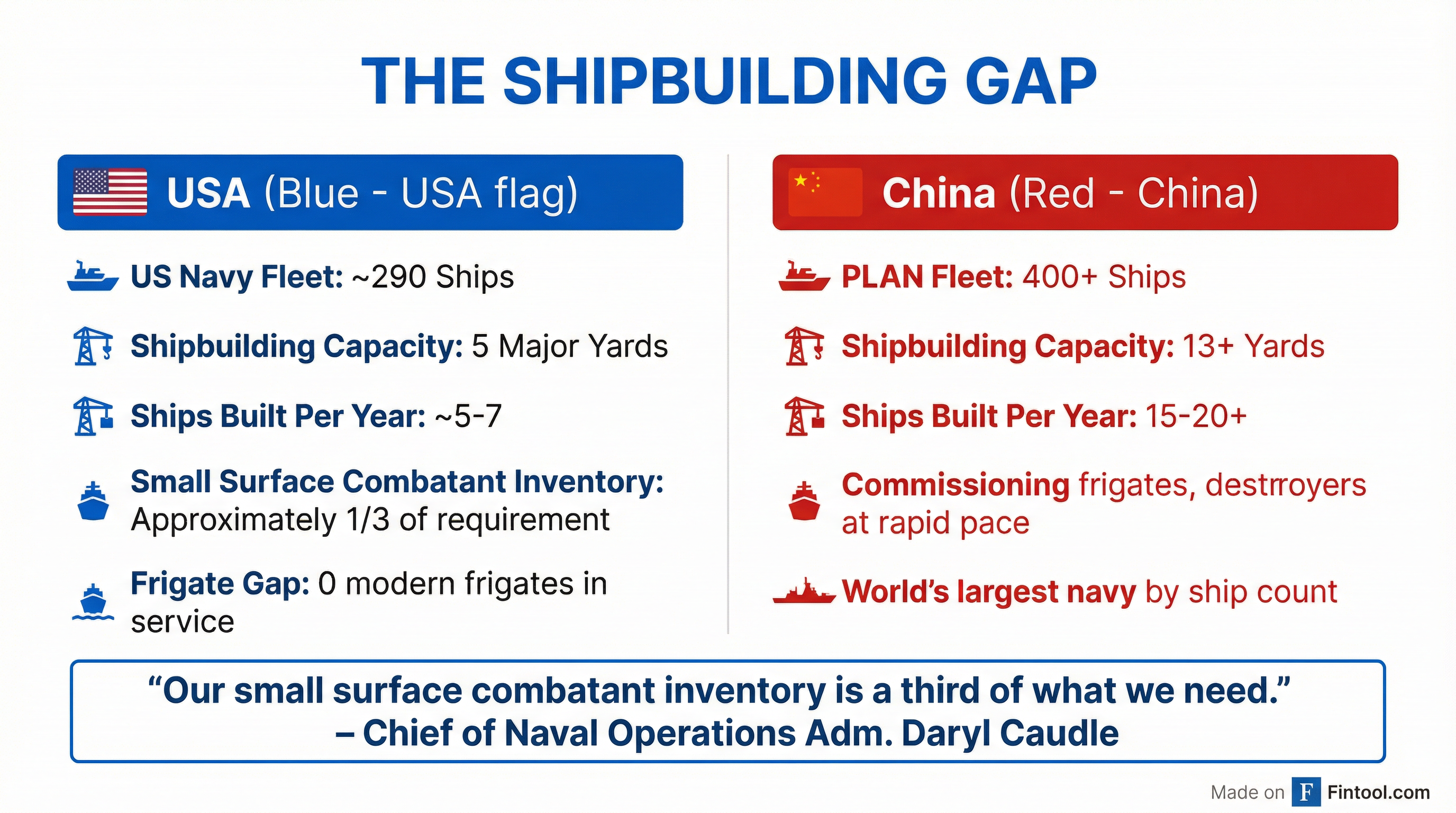 The urgency behind the Golden Fleet initiative is no secret. China's People's Liberation Army Navy has surpassed the U.S. in total ship count—over 400 vessels versus roughly 290—and is commissioning new destroyers and frigates at a pace American shipyards cannot match.