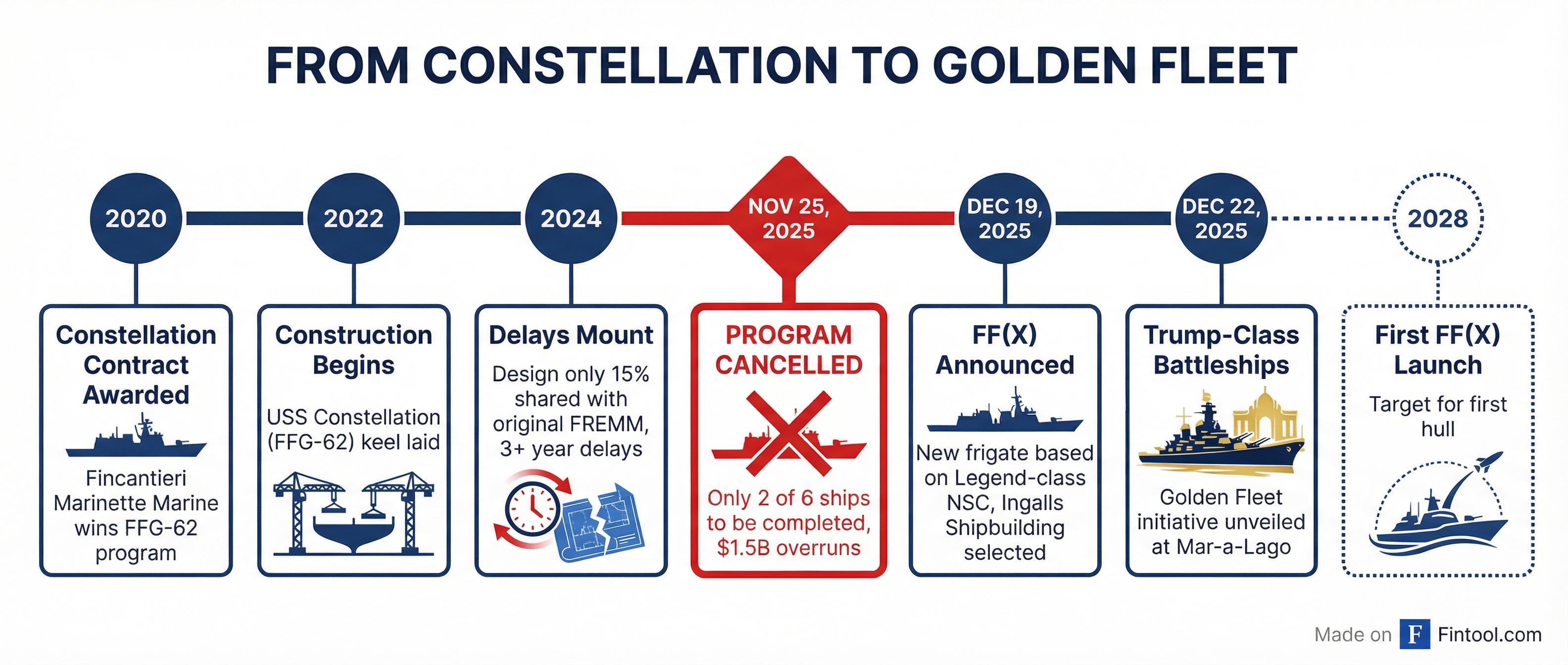 Under terms negotiated with Fincantieri, the Wisconsin shipyard will complete USS Constellation (FFG-62) and USS Congress (FFG-63), but the remaining four ships on contract have been cancelled. Fincantieri has already begun layoffs—93 positions in early December, with the company warning it must "balance the size and composition of our workforce with the projected workload."