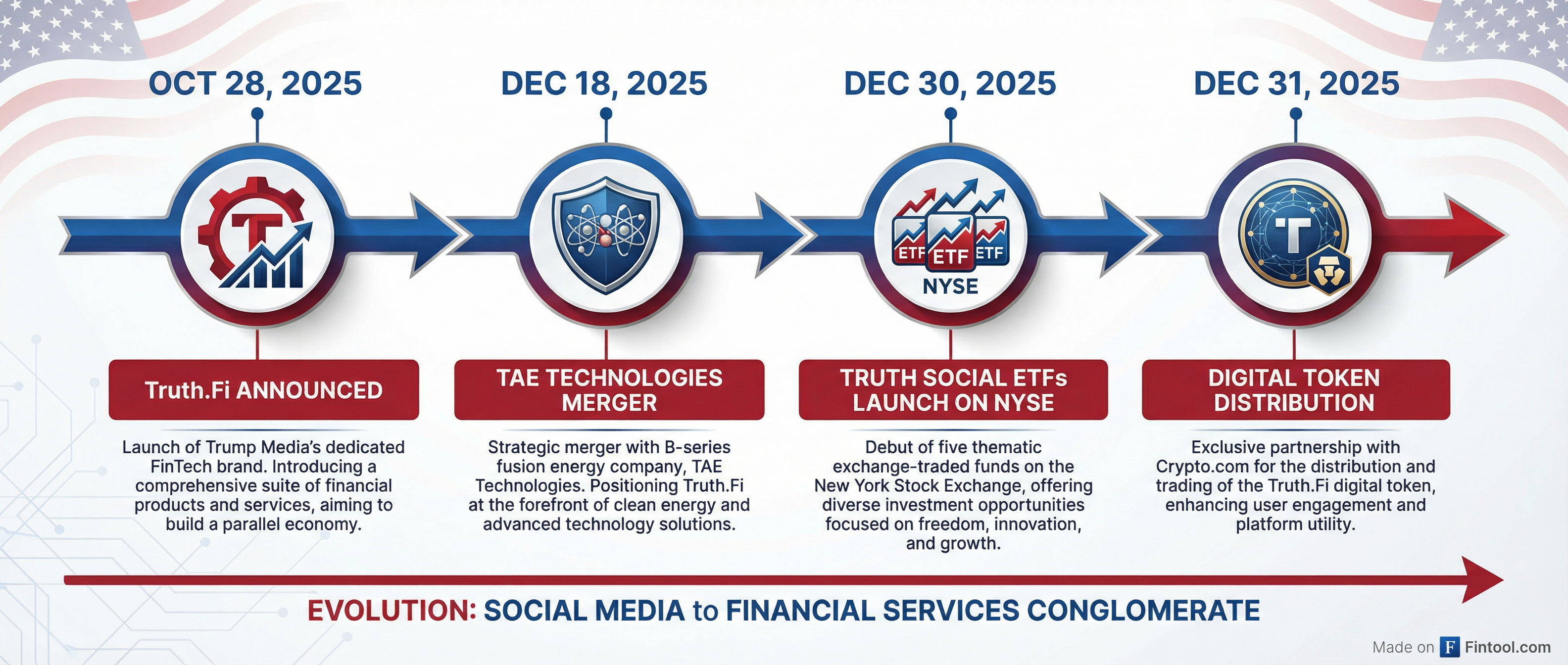December 18: Announced a $6+ billion all-stock merger with TAE Technologies, a fusion energy company, positioning Trump Media to become a diversified holding company spanning media, fintech, and energy.