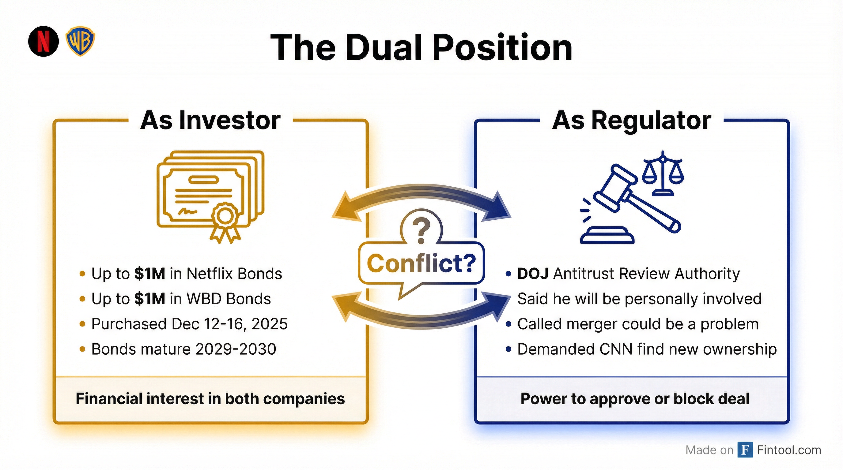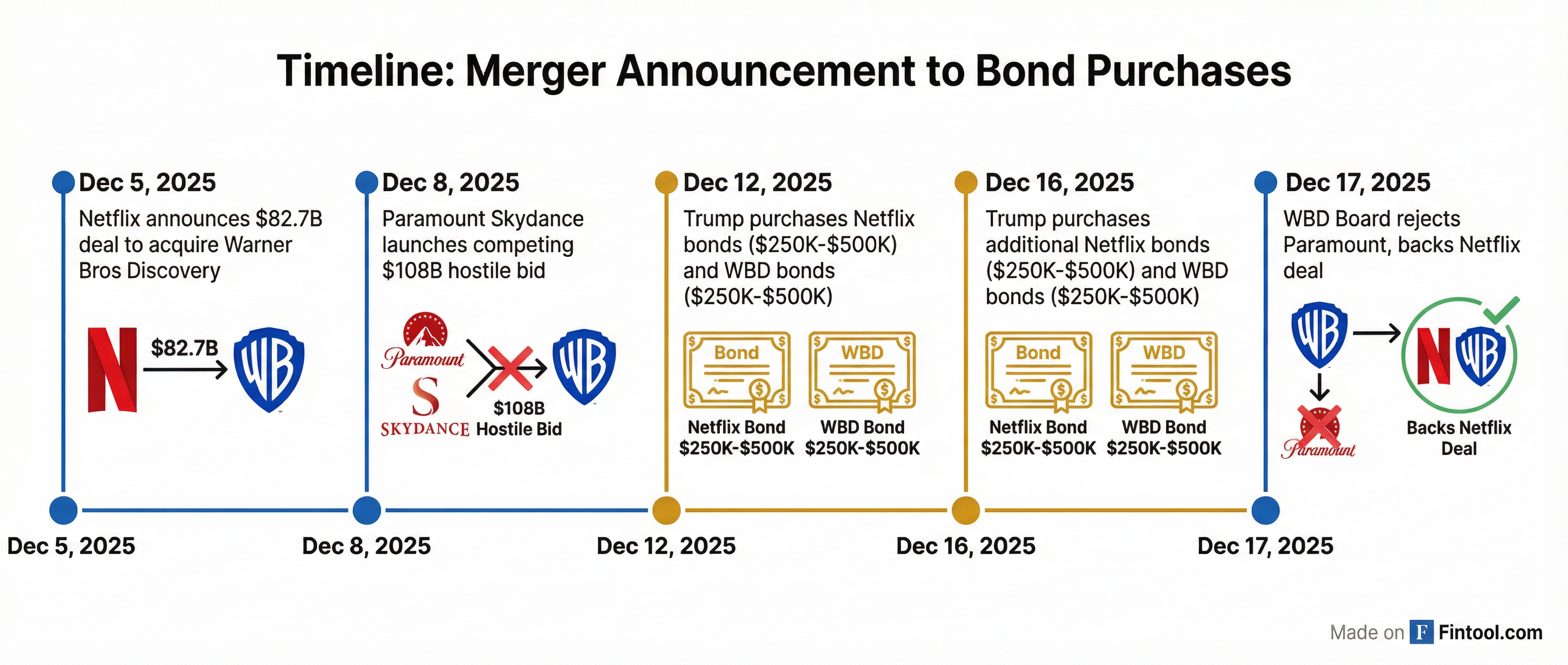 The timing is notable: Netflix and WBD announced their merger on December 5, 2025. Trump's first bond purchases came exactly one week later.
