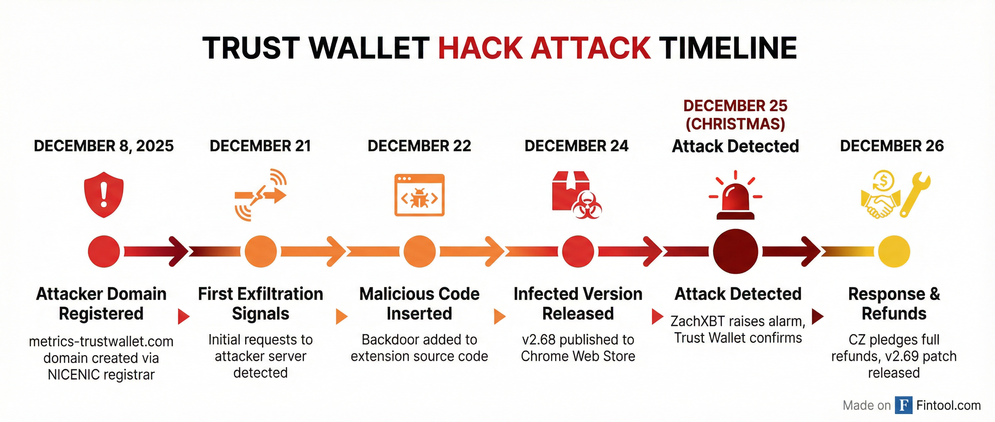 A professional hacking operation drained approximately $7 million from Trust Wallet users on Christmas Day through a compromised Chrome browser extension, marking one of the most sophisticated supply chain attacks in crypto history. Binance co-founder Changpeng "CZ" Zhao has committed to full reimbursement for all affected users.