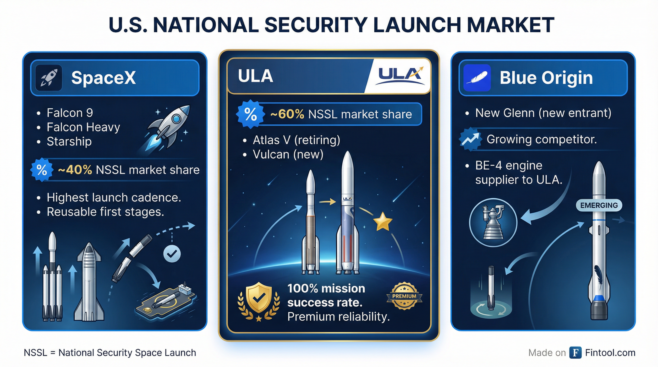 SpaceX has dramatically outpaced ULA in launch cadence, flying over 100 missions in 2025 compared to ULA's single-digit totals. Blue Origin, which supplies ULA's BE-4 engines, has emerged as a direct competitor with its New Glenn rocket achieving successful flights in late 2024.