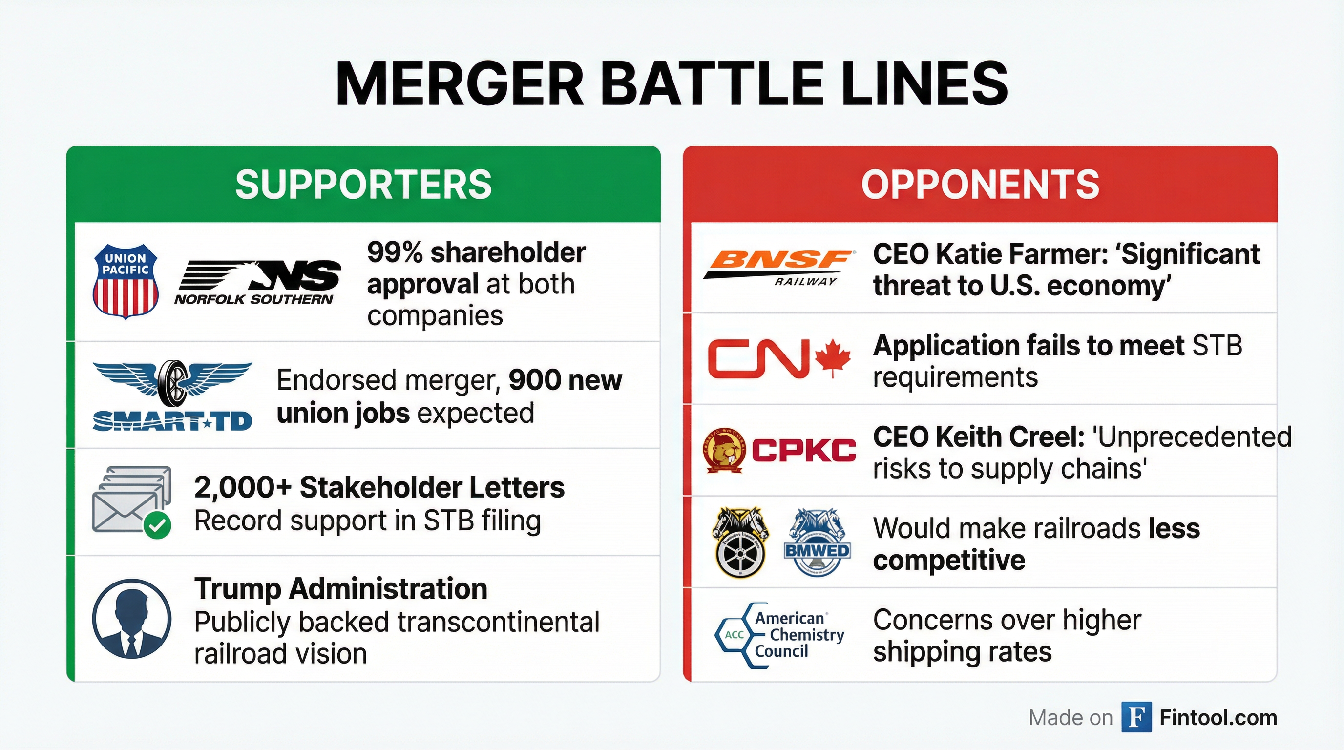 Labor unions are split. SMART-TD, the largest rail union, has endorsed the merger, but two Teamsters-affiliated unions—the Brotherhood of Locomotive Engineers and Trainmen (BLET) and the Brotherhood of Maintenance of Way Employes Division (BMWED)—oppose it, arguing it would make railroads less competitive.