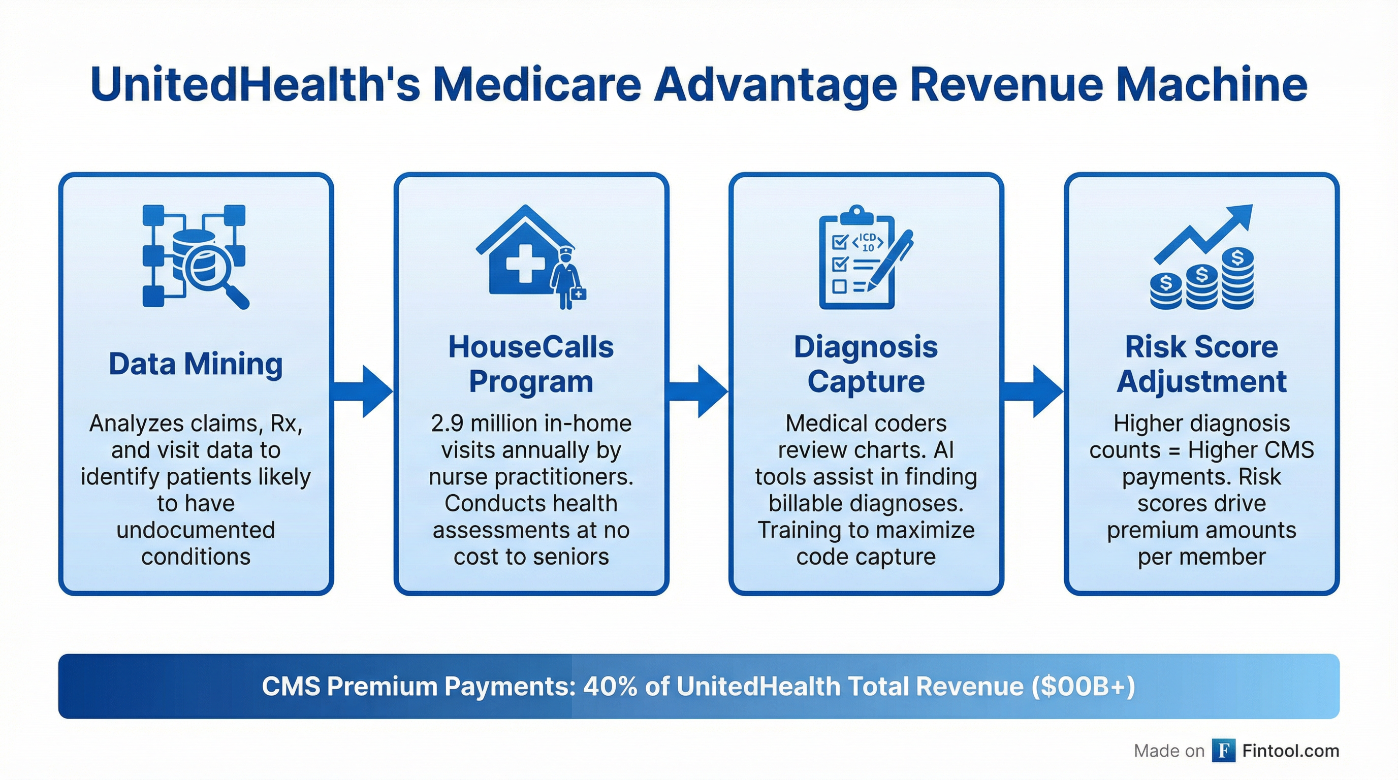 HouseCalls Program: Optum nurse practitioners conducted 2.9 million free in-home visits to Medicare Advantage enrollees in 2024 alone. UnitedHealth describes these as preventive care that helps seniors "live healthier at home." The Senate report views them as a diagnosis capture mechanism that drives risk scores higher.