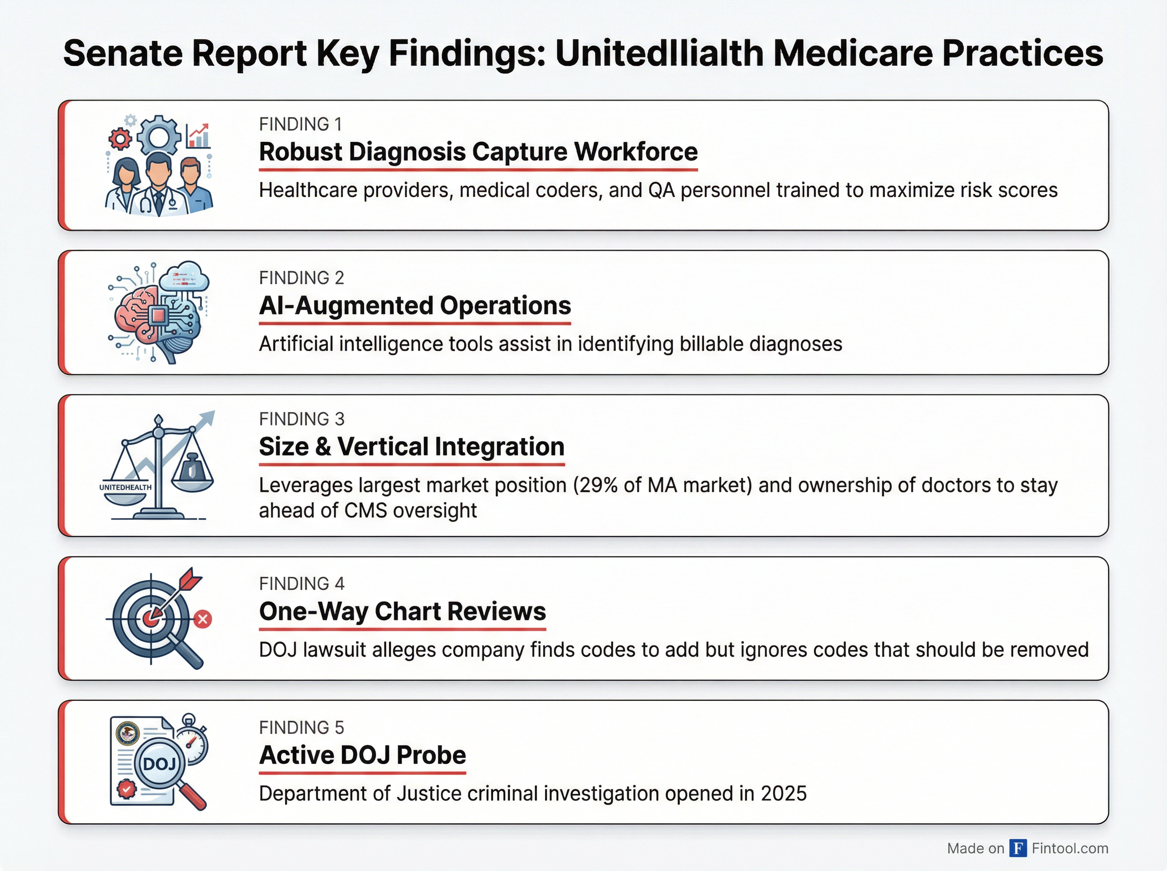 A U.S. Senate Judiciary Committee investigation found that Unitedhealth Group-1.01% deployed "aggressive strategies" backed by a "robust" workforce—augmented by artificial intelligence—to capture diagnoses that drive higher Medicare Advantage payments from the government.