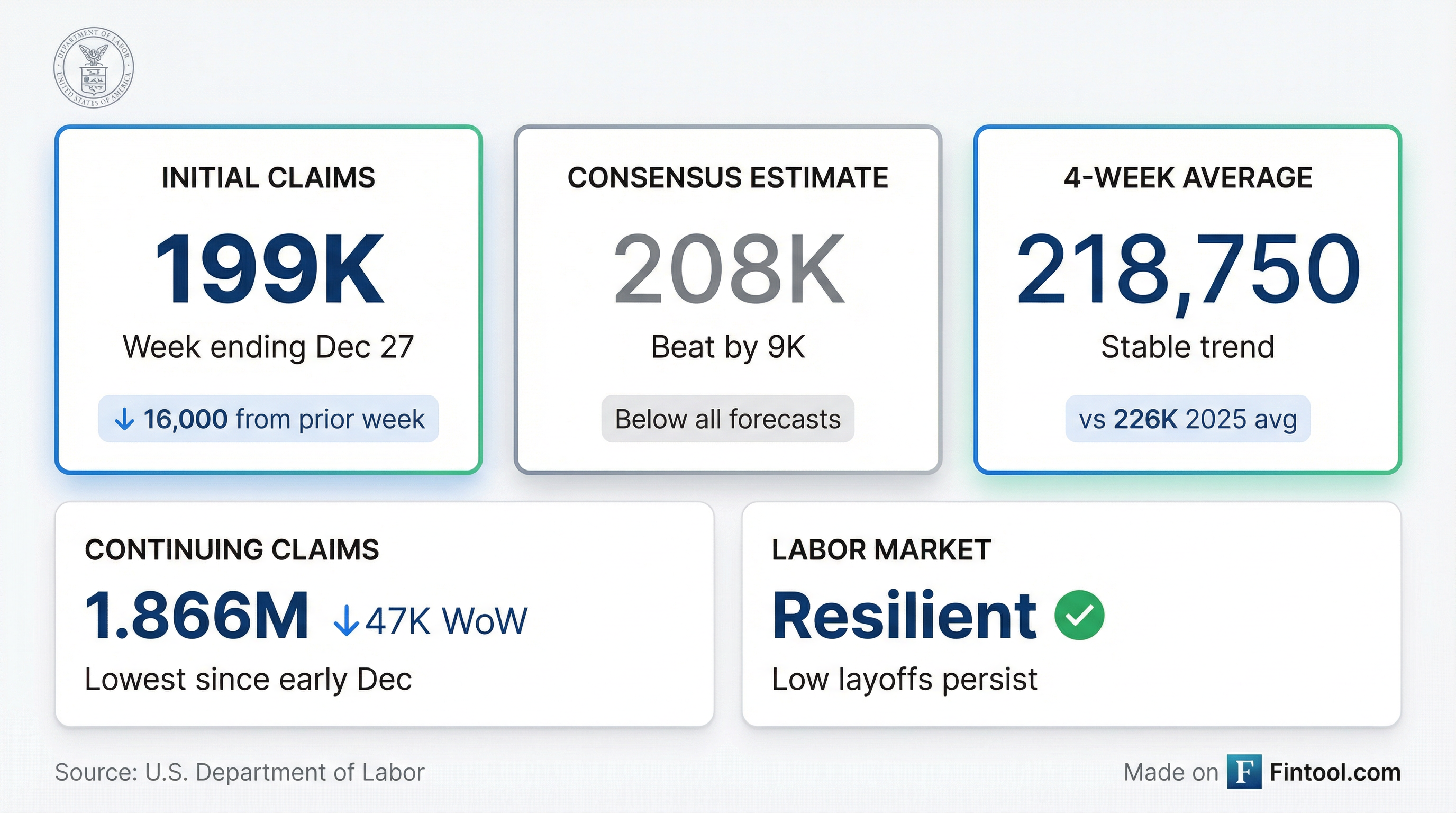 Initial unemployment claims unexpectedly dropped to 199,000 for the week ending December 27—dipping below the psychologically important 200,000 threshold and coming in well below the 208,000 consensus estimate. The 16,000 decline from the prior week's 215,000 marks just the fourth reading below 200,000 since the start of 2024, signaling that layoffs remain historically muted even as the broader labor market has cooled from its post-pandemic highs.