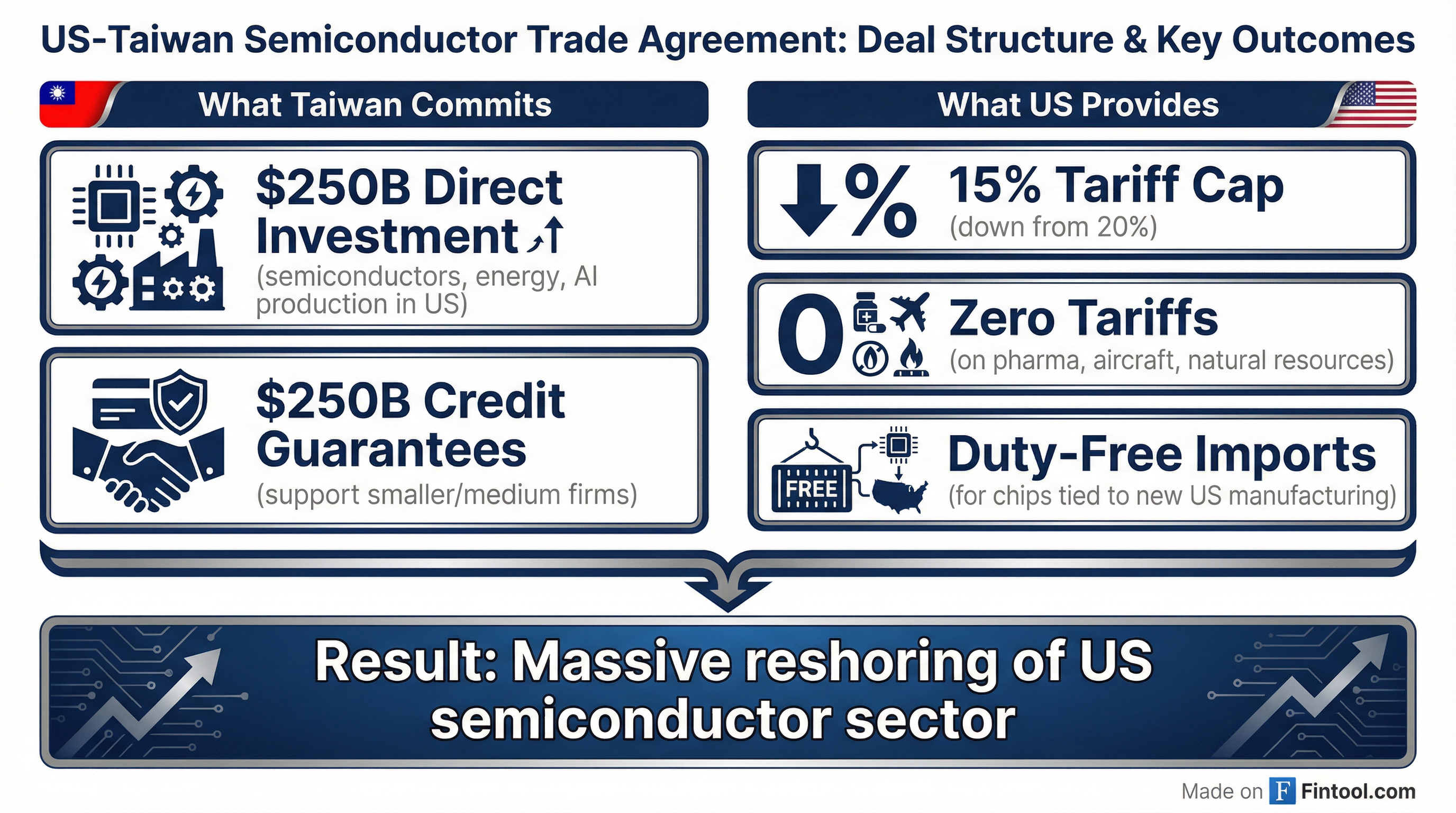 Credit Guarantees ($250B): Taiwan's government will backstop an additional quarter-trillion in financing to support smaller and medium-sized Taiwanese firms building US operations. Lutnick indicated this concession addressed concerns that only giants like TSMC could afford the capital requirements.