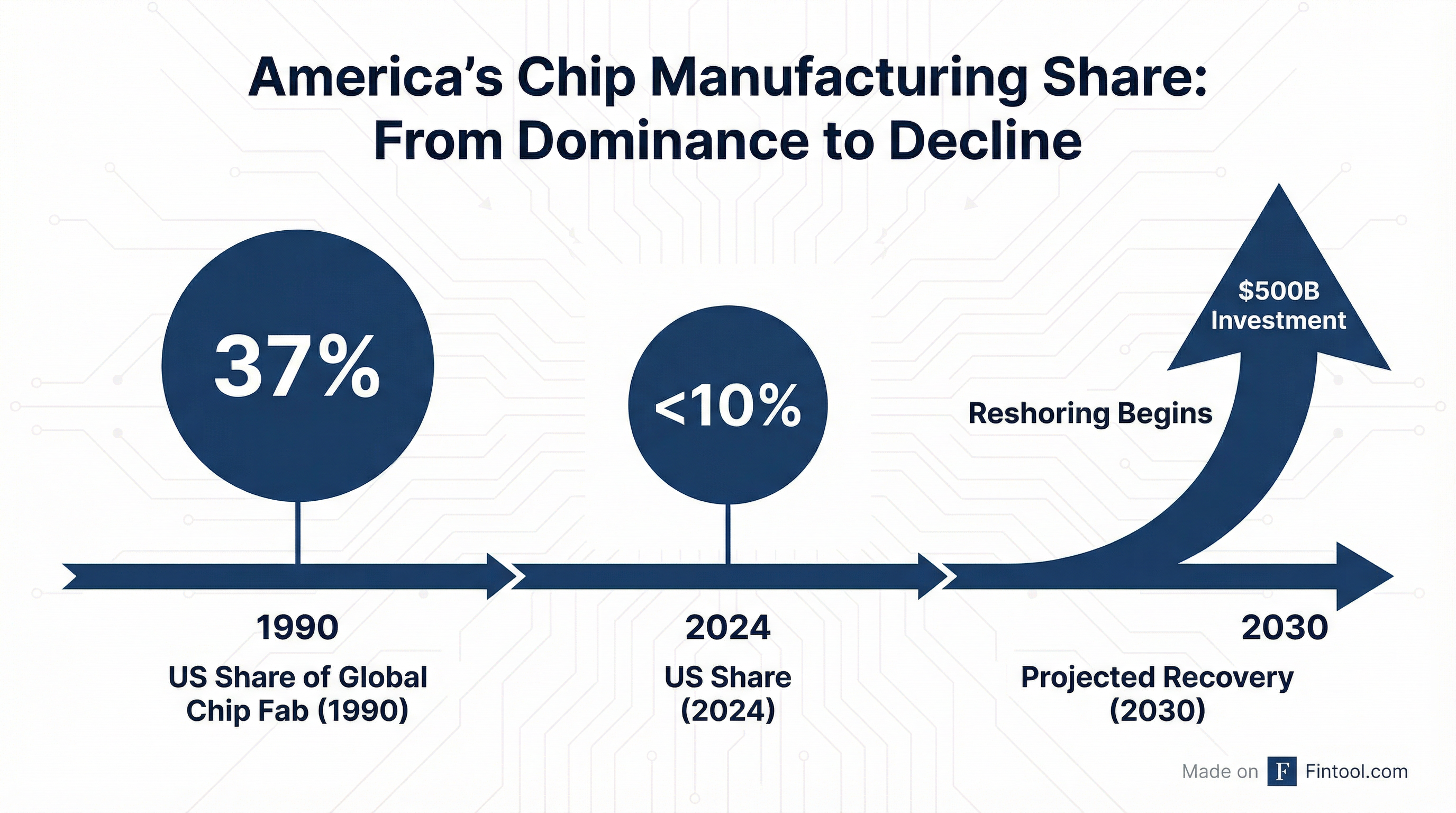 The Commerce Department emphasized that US semiconductor fabrication capacity fell from 37% of global production in 1990 to under 10% by 2024—a hollowing out that left the world's largest economy dependent on geopolitically sensitive supply chains.