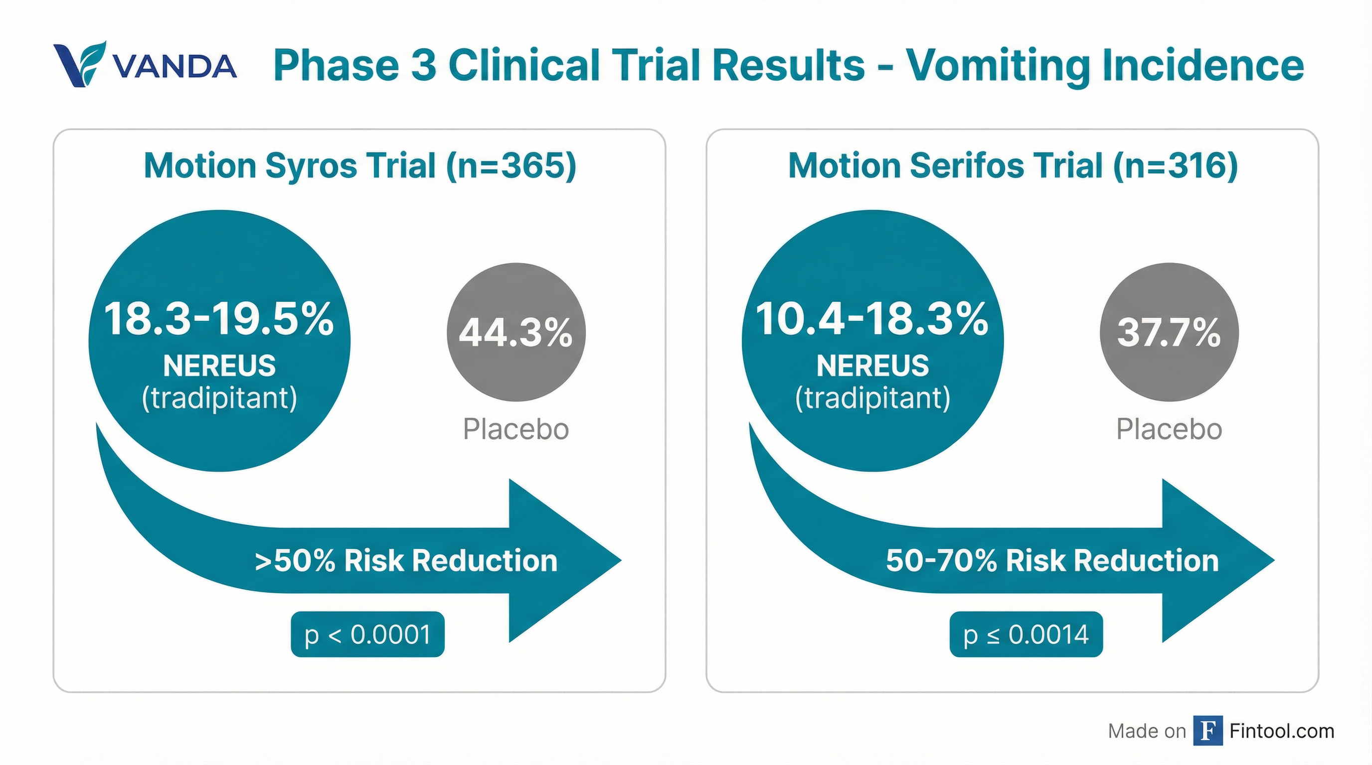 With a market cap of approximately $425 million and minimal debt ($10.9M)*, Vanda trades at a fraction of what the GLP-1 nausea opportunity alone could be worth. The company's existing hypercortisolism business generated $56.3 million in Q3 2025 revenue , providing a foundation while the NEREUS franchise scales.