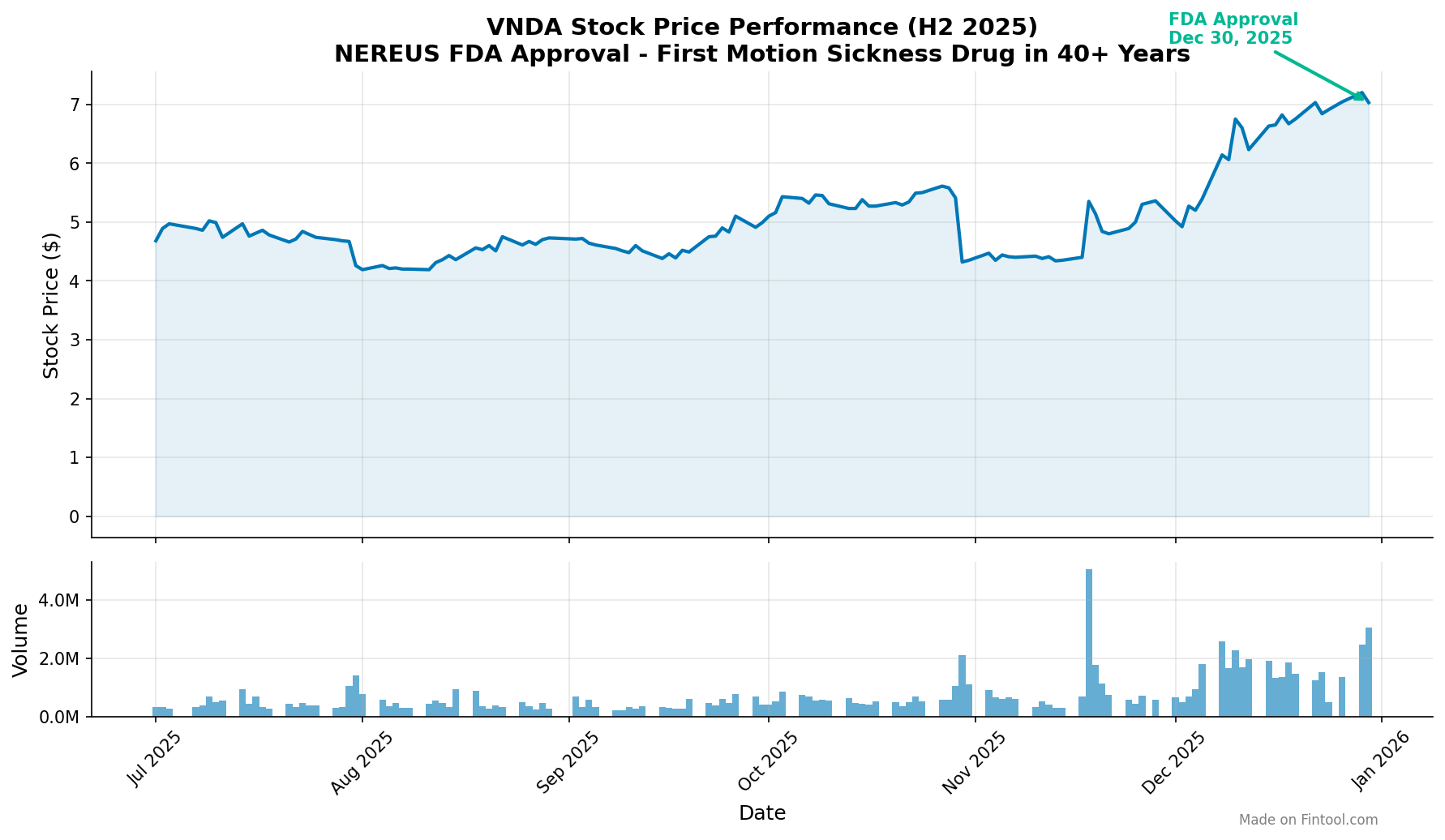 Vanda Pharmaceuticals+25.46% secured FDA approval for NEREUS (tradipitant) on December 30, 2025 — the first new pharmacologic treatment for motion sickness in over four decades . Shares jumped as much as 18% in premarket trading on the news, with the stock touching three-year highs near $8.29 before settling at $7.03 by market close .