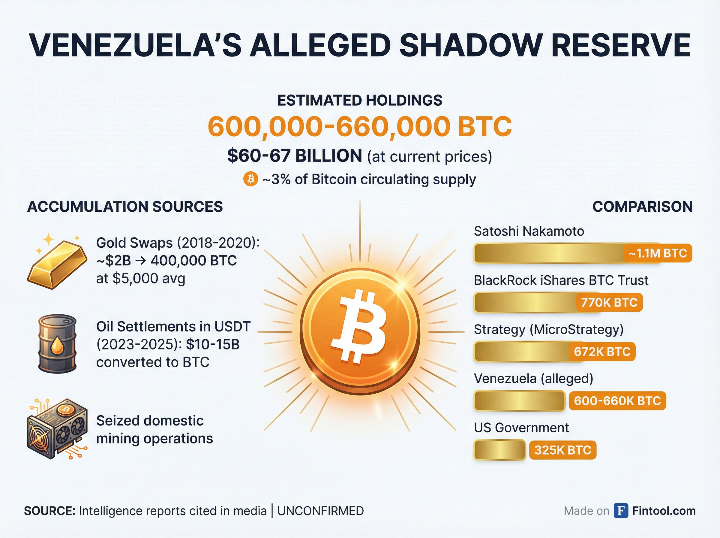If true, this would place Venezuela among the largest Bitcoin holders on the planet, rivaling institutional giants like BlackRock's iShares Bitcoin Trust (770,000 BTC) and MicroStrategy (672,000 BTC).