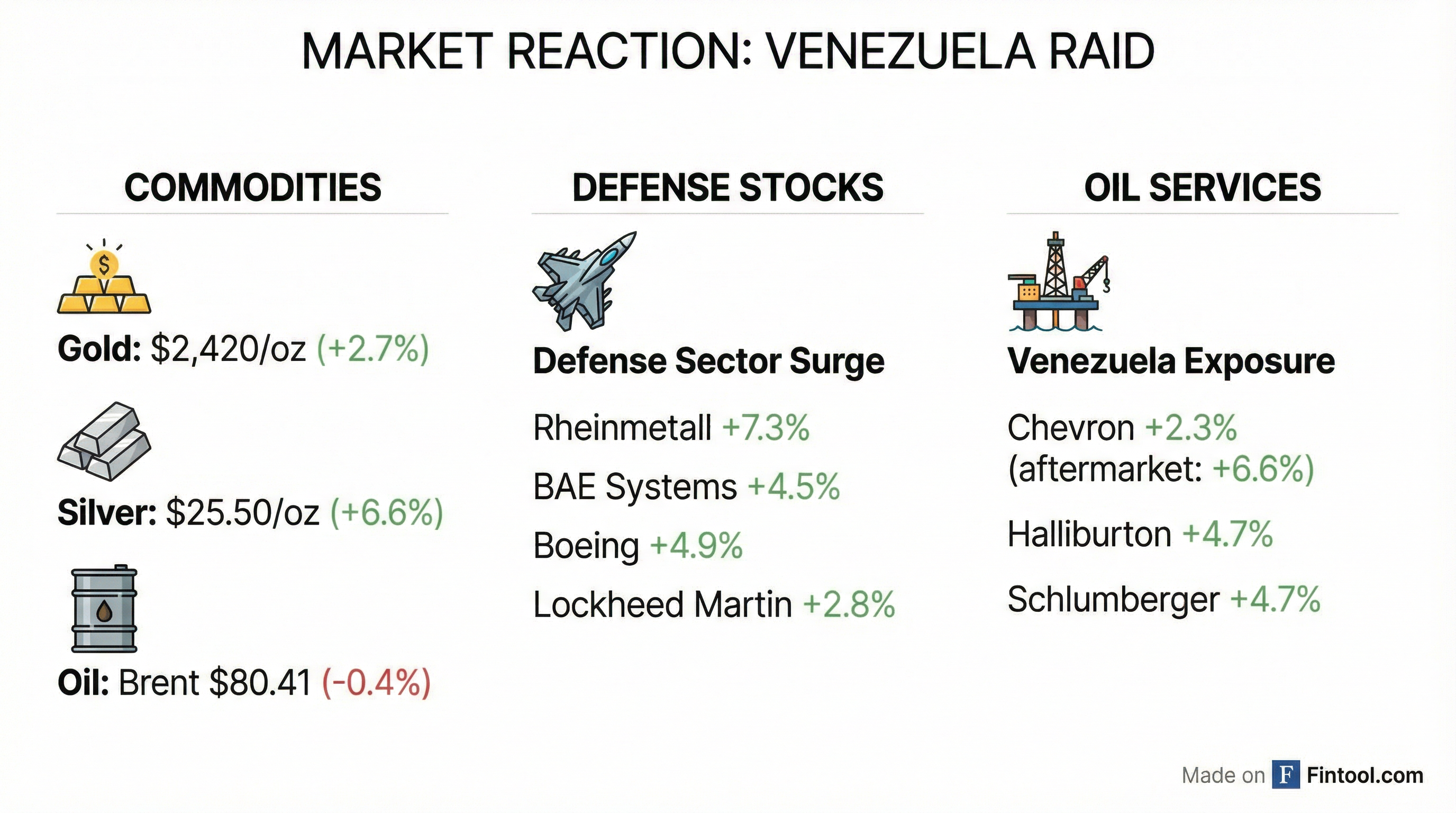 U.S. forces captured Venezuelan President Nicolás Maduro in a daring overnight raid on Saturday—and markets are still processing the implications. Gold jumped 2.7% to $4,420 an ounce, defense stocks across Europe and the U.S. surged as much as 7%, and intelligence reports surfaced alleging Venezuela secretly accumulated up to $60 billion in Bitcoin. Oil, meanwhile, barely moved.