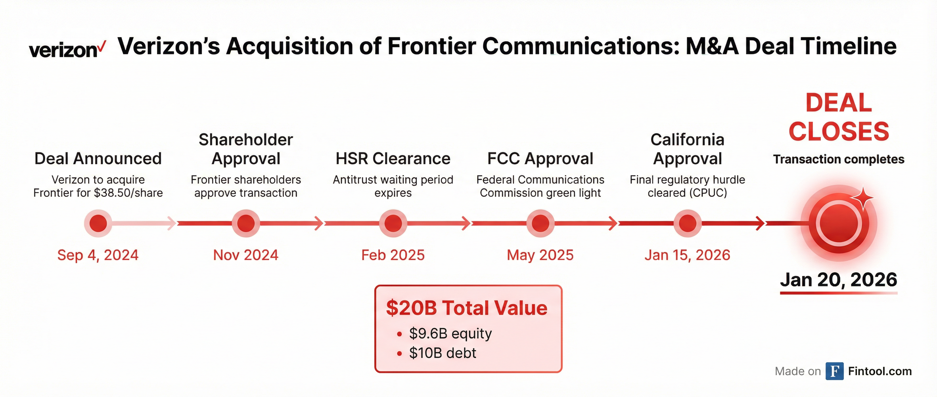 Verizon is paying $38.50 per share in cash for Frontier, representing a 43.7% premium to Frontier's 90-day volume-weighted average price before deal speculation emerged. The transaction values Frontier's equity at approximately $9.6 billion, with Verizon assuming roughly $12 billion in Frontier debt, bringing the total enterprise value to approximately $20 billion.