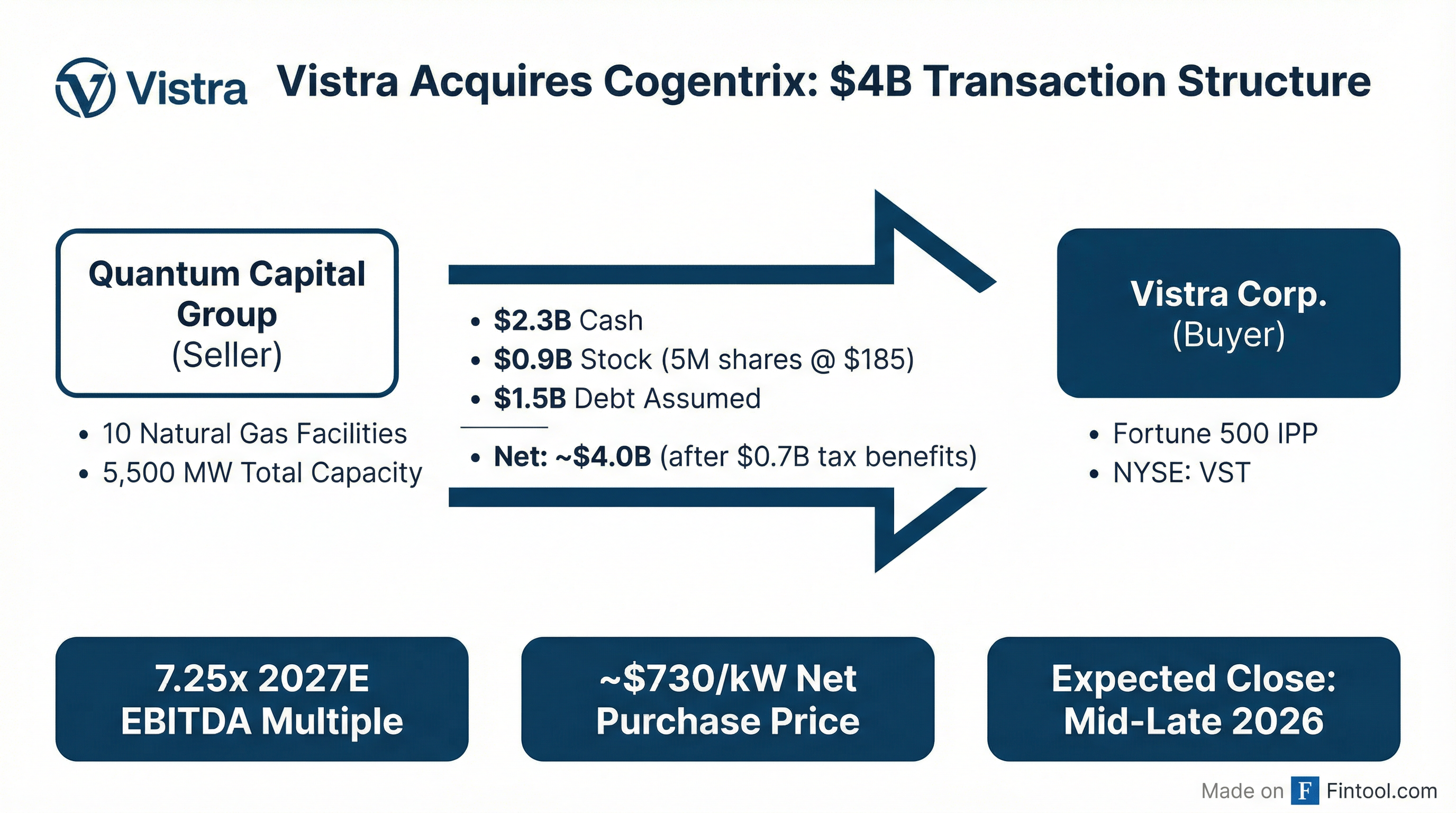 Vistra will pay approximately $2.3 billion in cash and issue 5 million shares (valued at $185 per share, or $925 million) to Quantum Capital Group, Cogentrix's owner. The company will also assume roughly $1.5 billion in existing debt, bringing the gross transaction value to $4.7 billion—or approximately $4.0 billion net of an estimated $700 million in tax benefits.