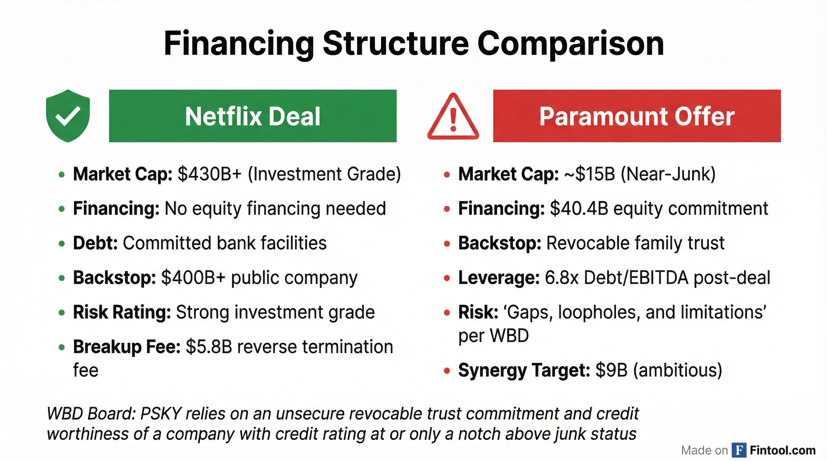 Leverage Explosion: A combined Paramount-WBD would carry 6.8x gross leverage (debt to EBITDA)—a "risky capital structure that is vulnerable to even potentially small changes in the PSKY or WBD business between signing and closing."