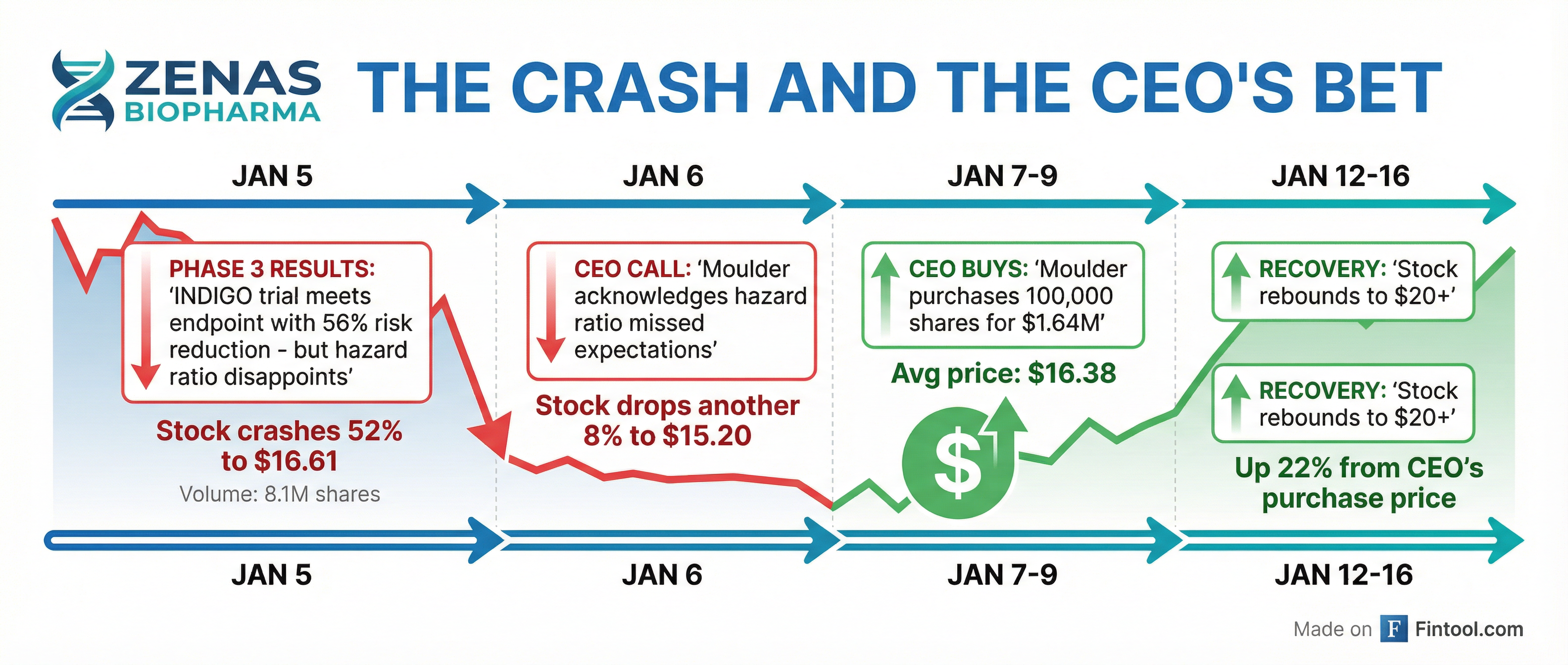 When Zenas Biopharma+1.15%'s stock cratered 52% in a single day following "positive" Phase 3 trial results that disappointed Wall Street, most investors ran for the exits. CEO Lonnie Moulder ran in the opposite direction—writing checks totaling $1.64 million to buy 100,000 shares over three consecutive days.